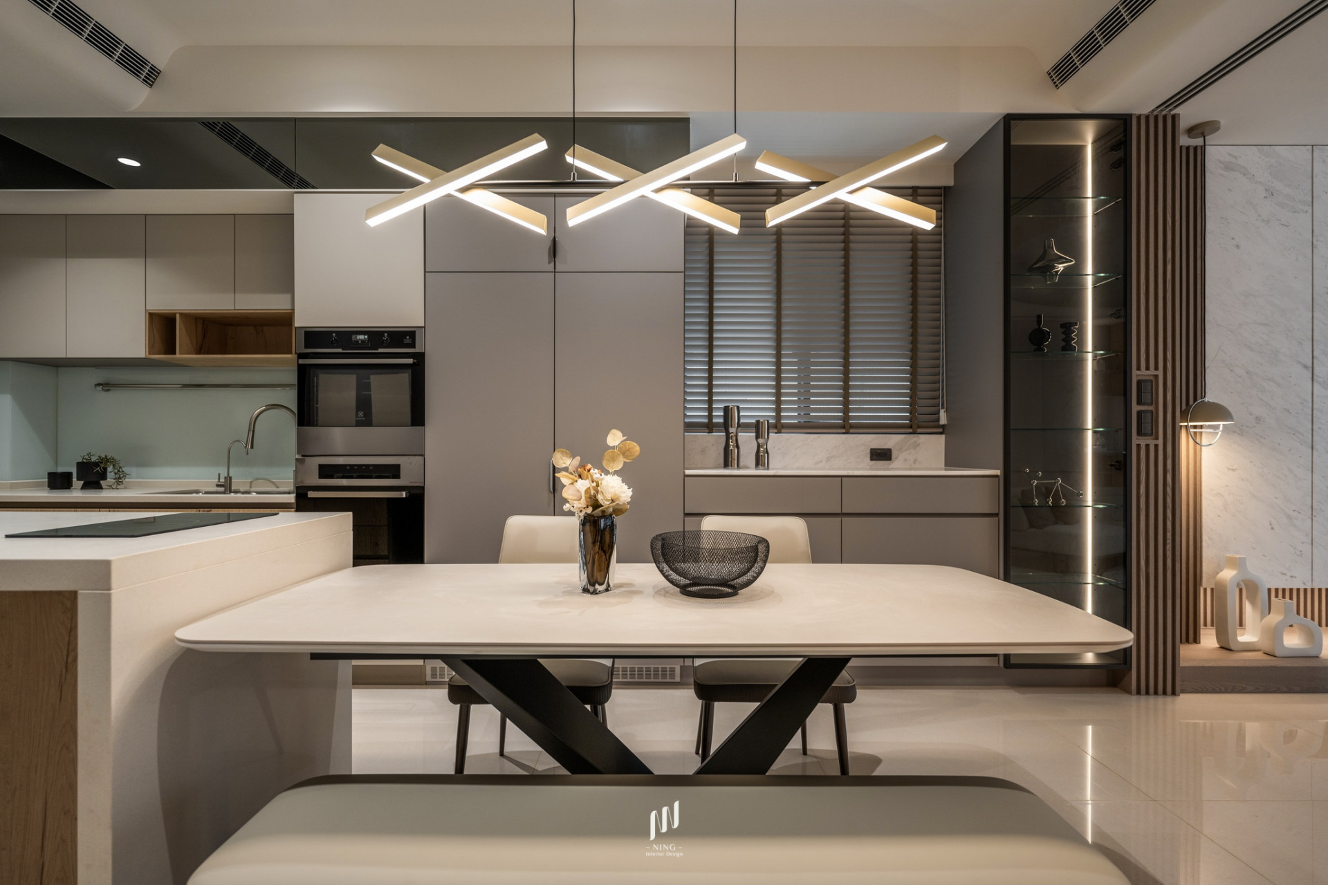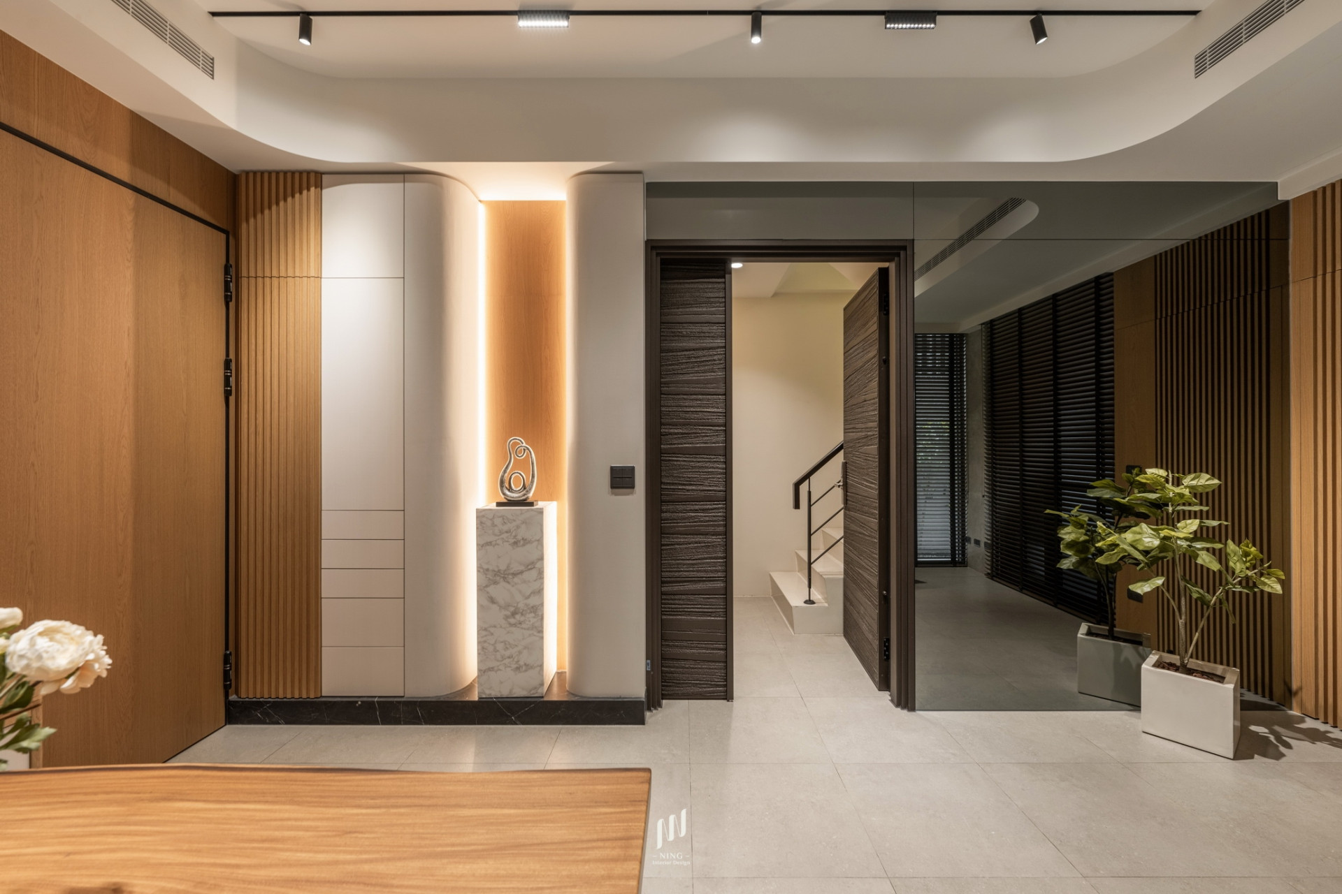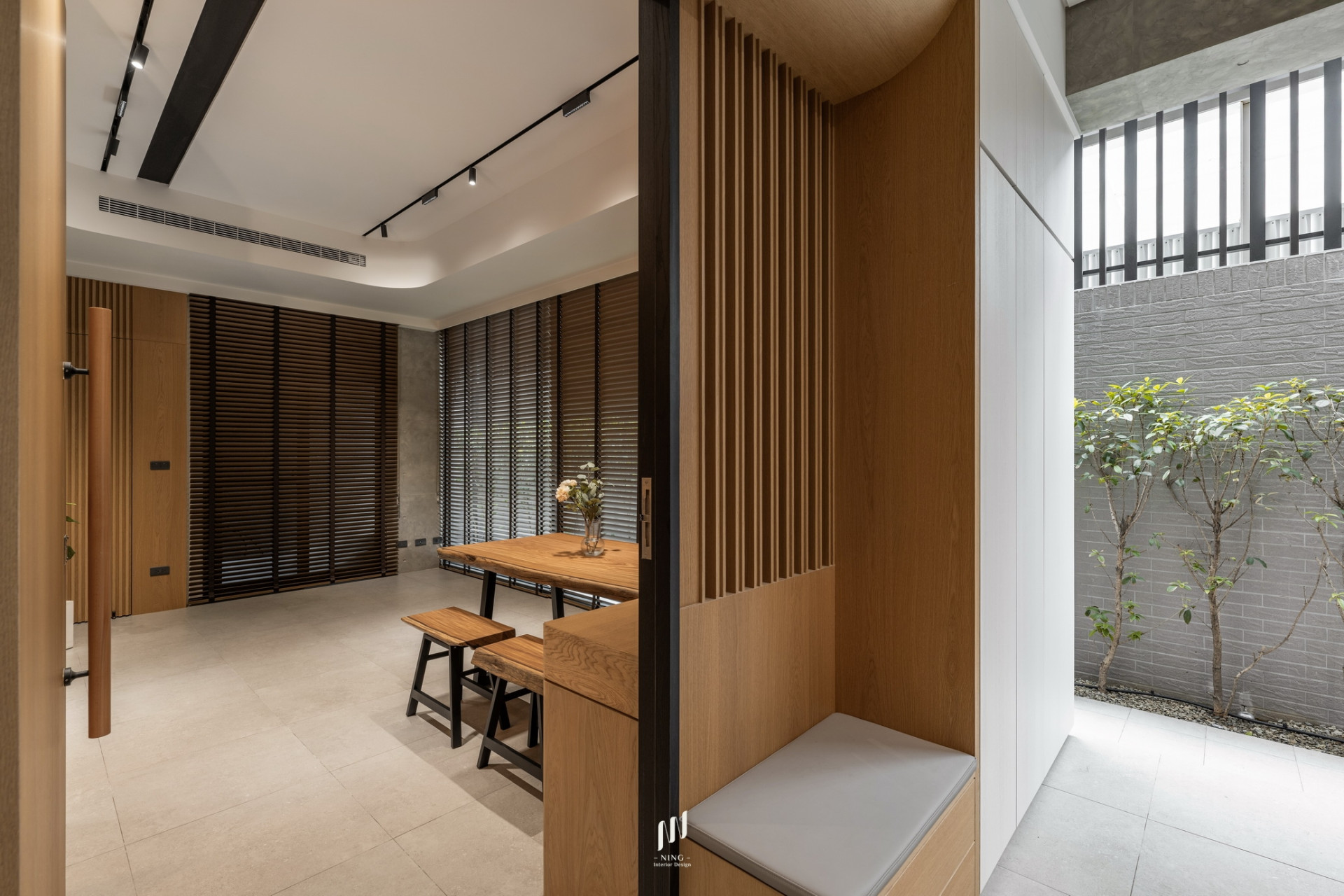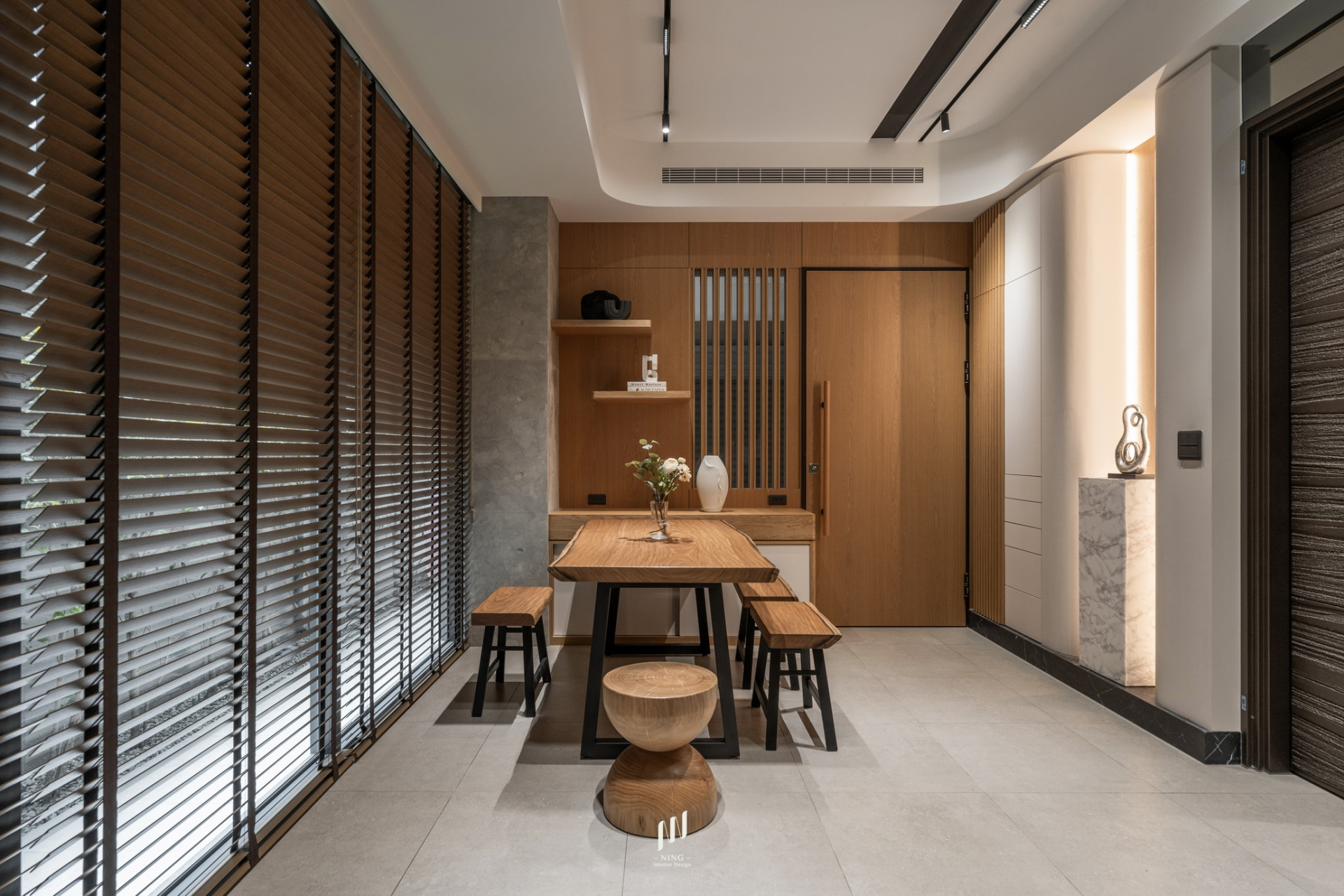 玄關、餐廳與梯廳以推拉門與直紋玻璃界定,讓光線自由穿透,增添開闊感,同時確保空調流動更有效率。