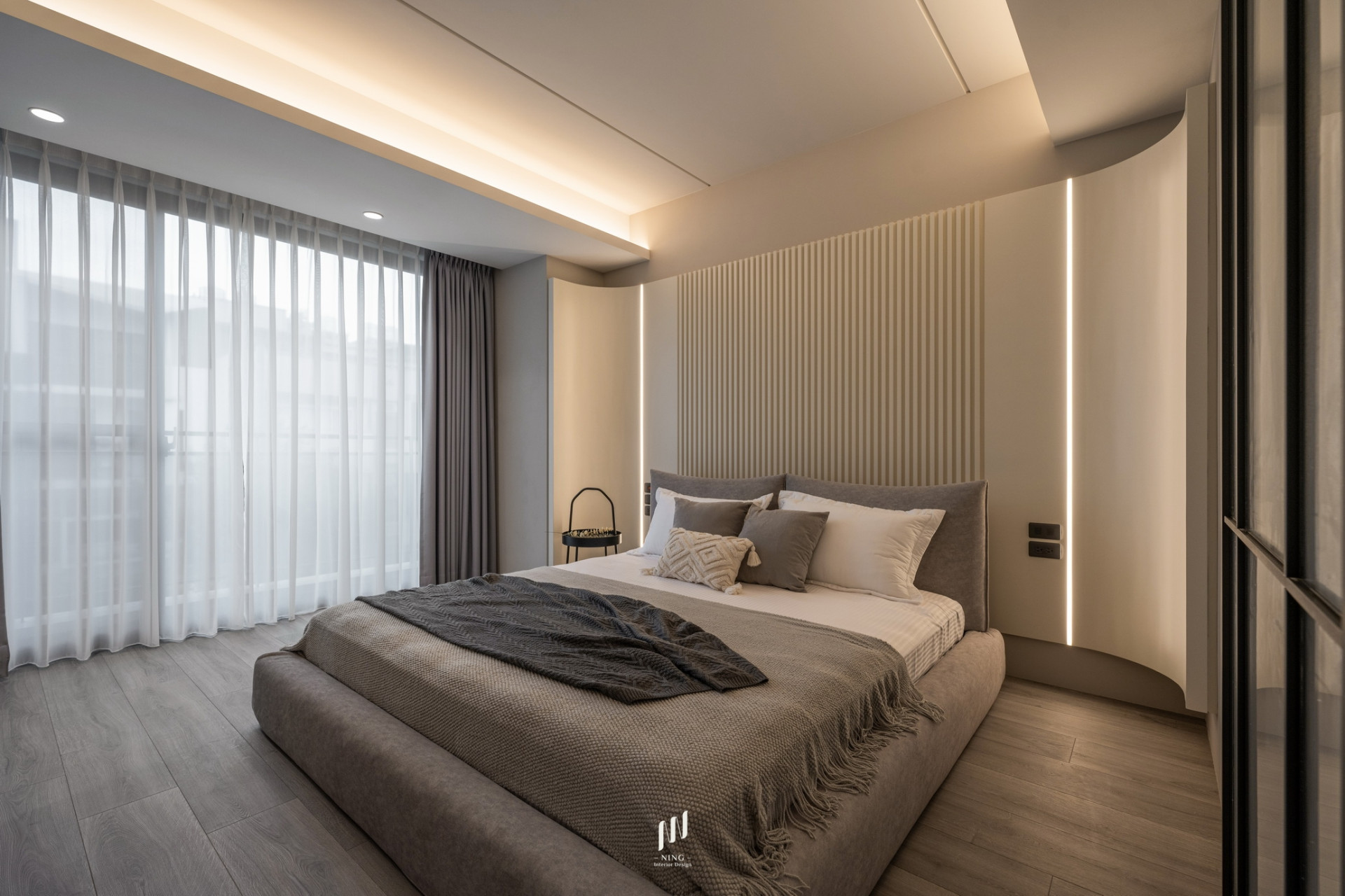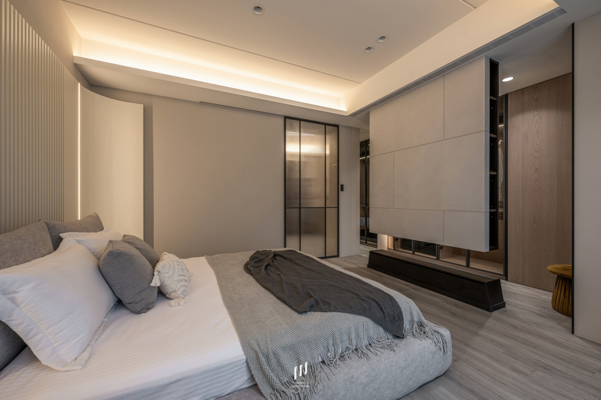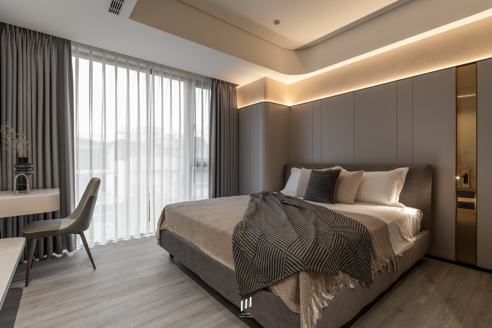 主臥則延續簡約高雅的調性,奶茶灰色烤漆床頭搭配格柵線條與直線燈,打造寧靜舒適的休憩空間。