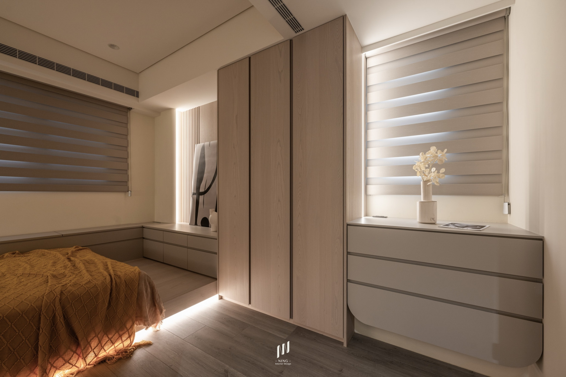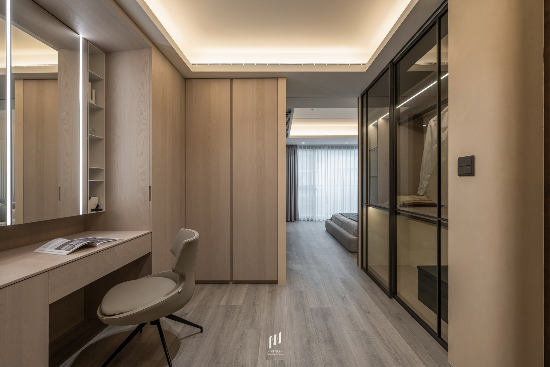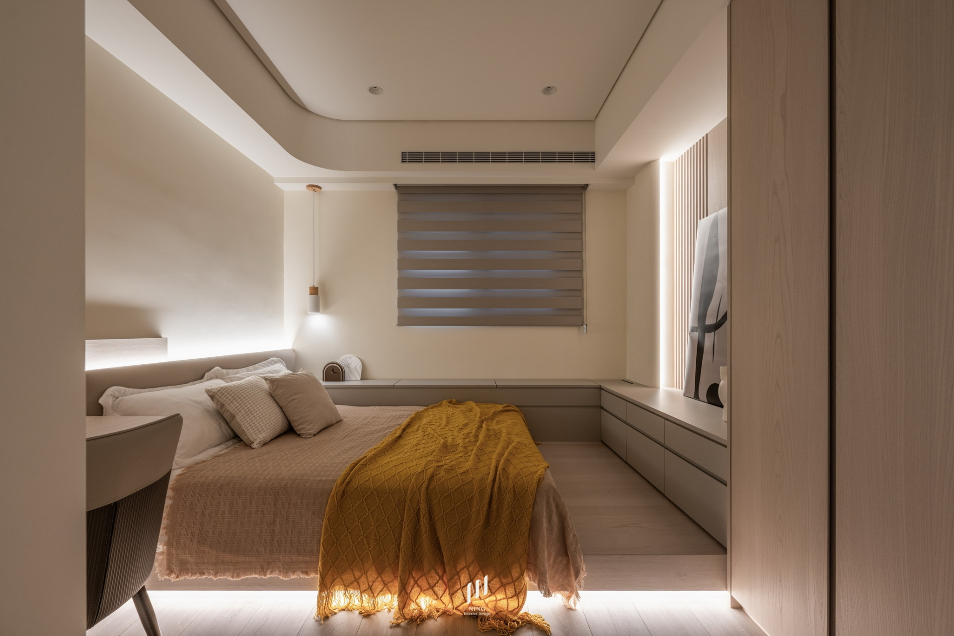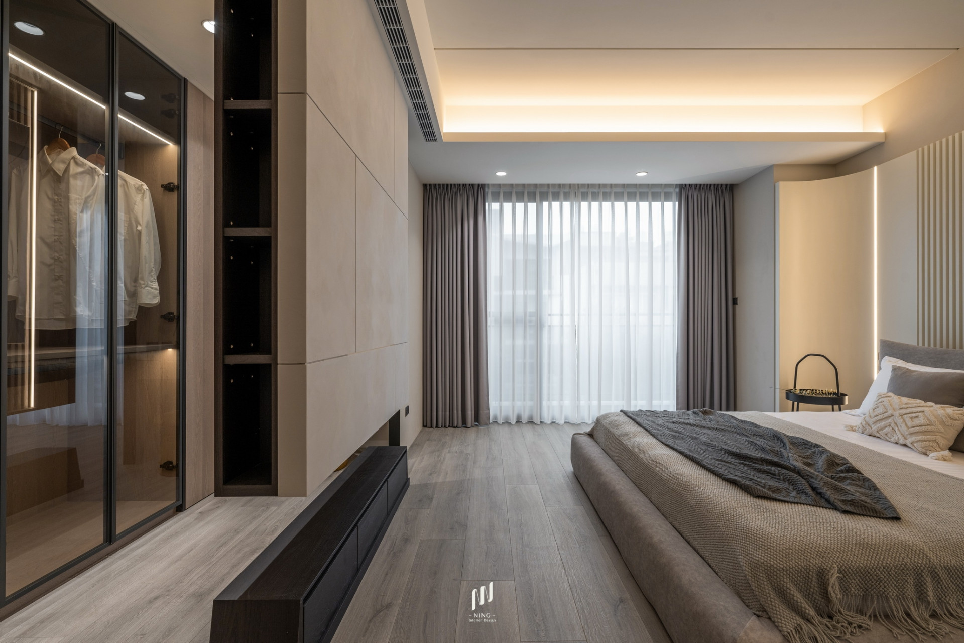 主臥則延續簡約高雅的調性,奶茶灰色烤漆床頭搭配格柵線條與直線燈,打造寧靜舒適的休憩空間。