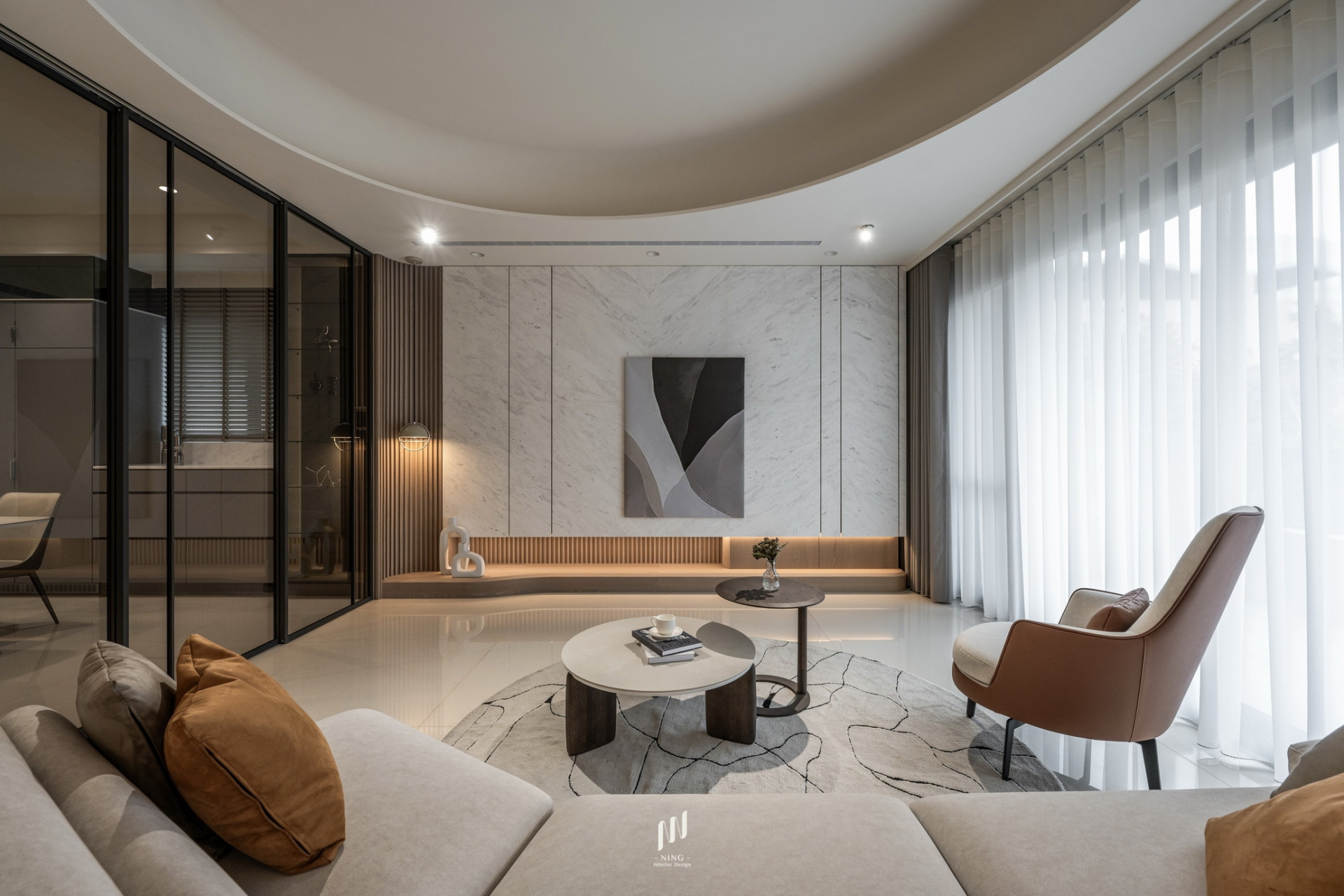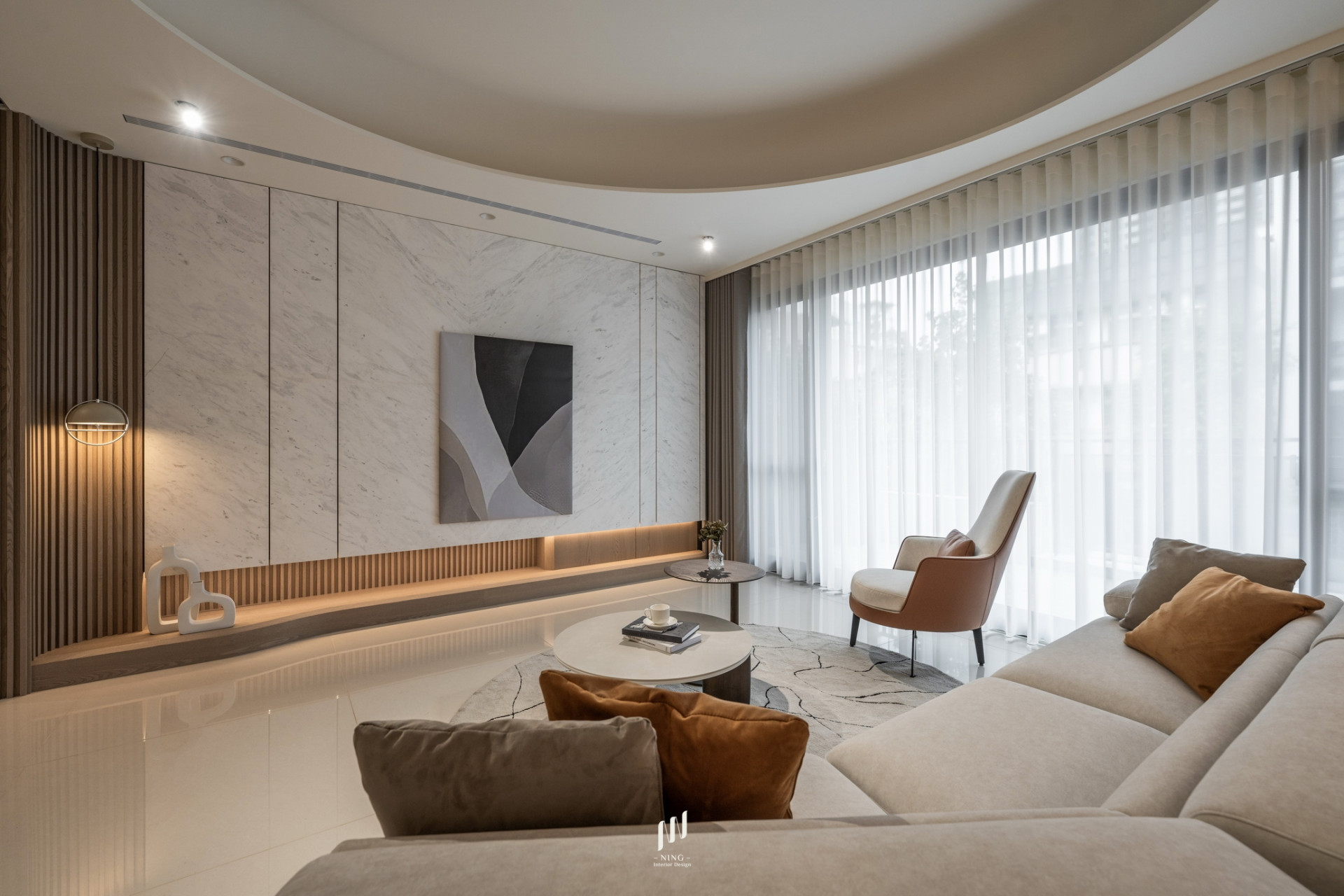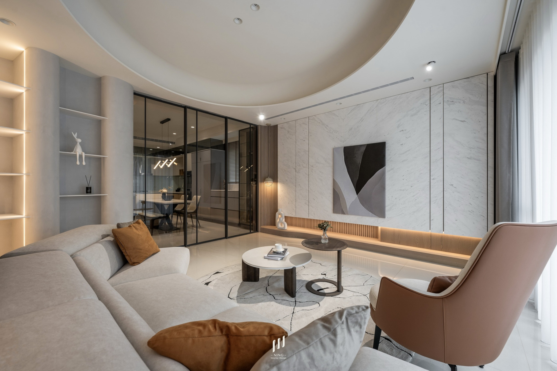 客廳電視主牆選用雪白銀狐石材,透過光影變化展現細膩層次,使空間更顯沉穩大氣。