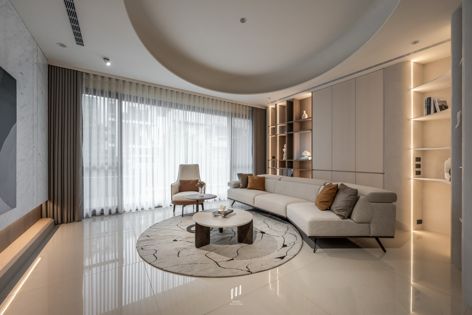 懸浮式電視牆與書櫃增添趣味與機能,讓空間靈活且富層次感。