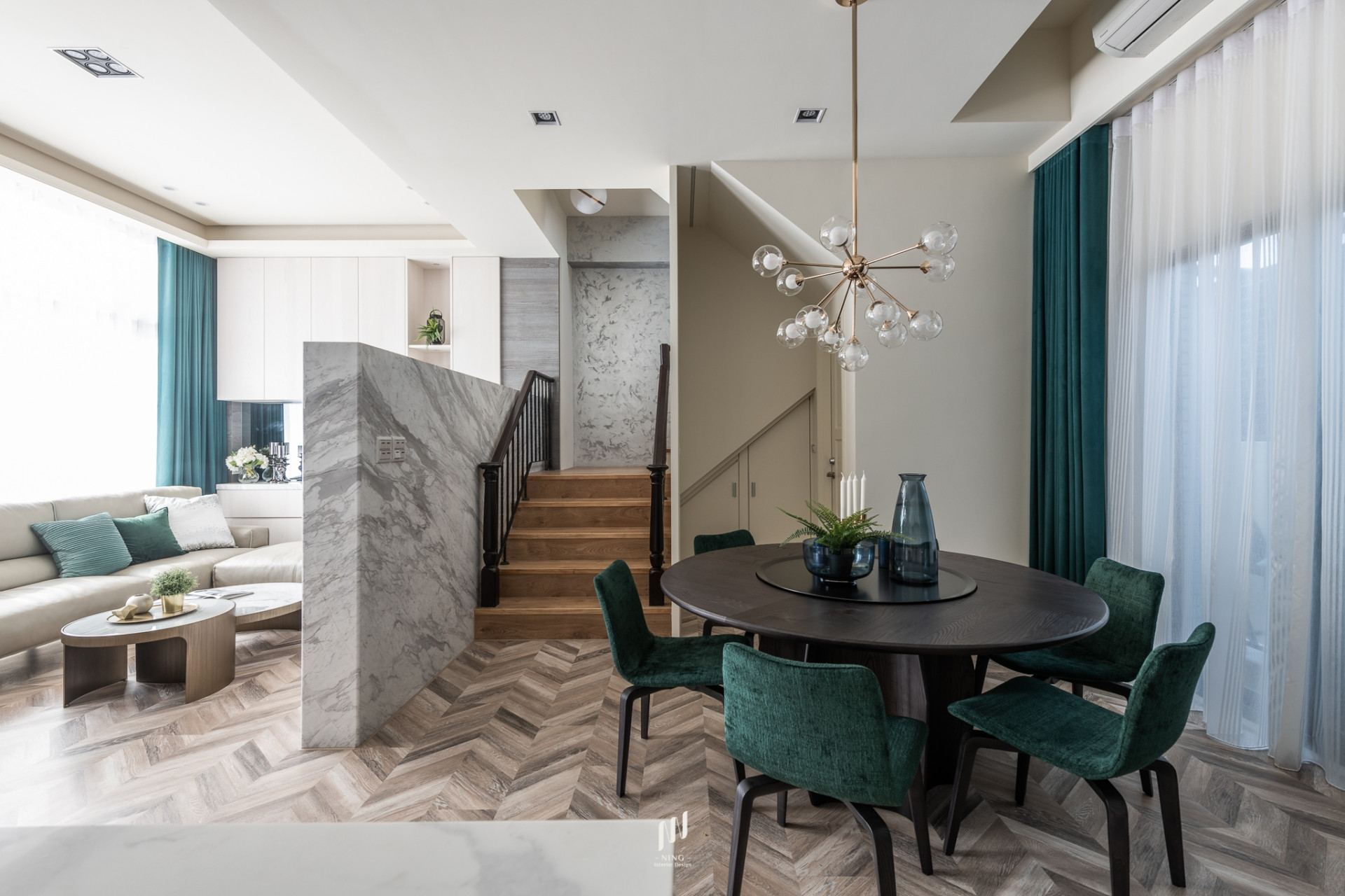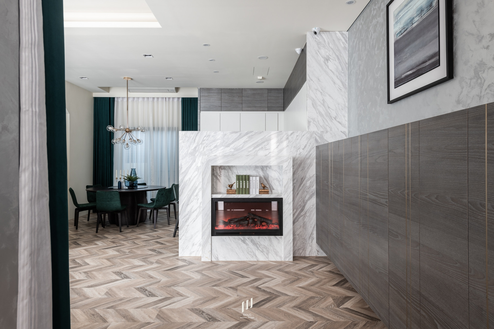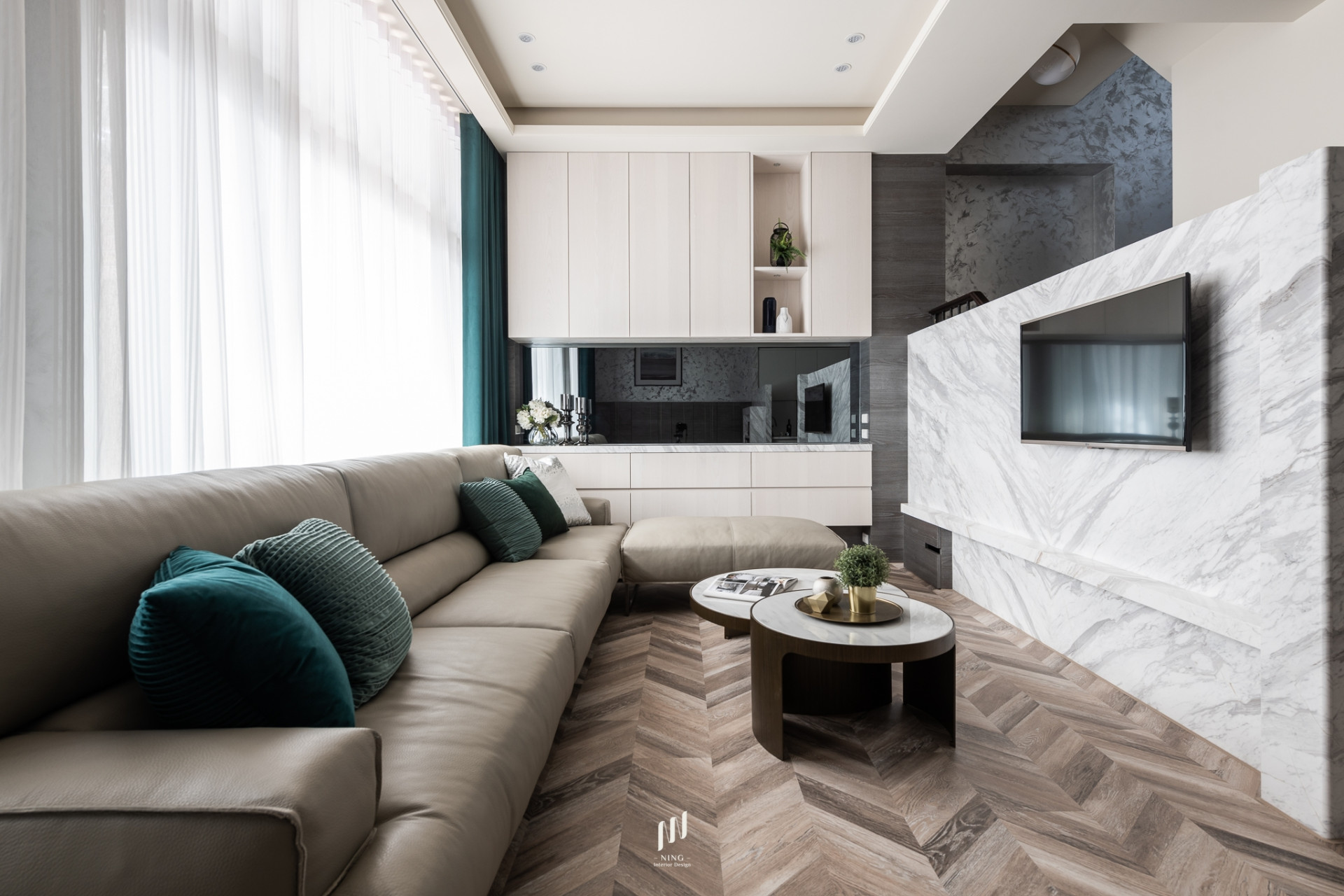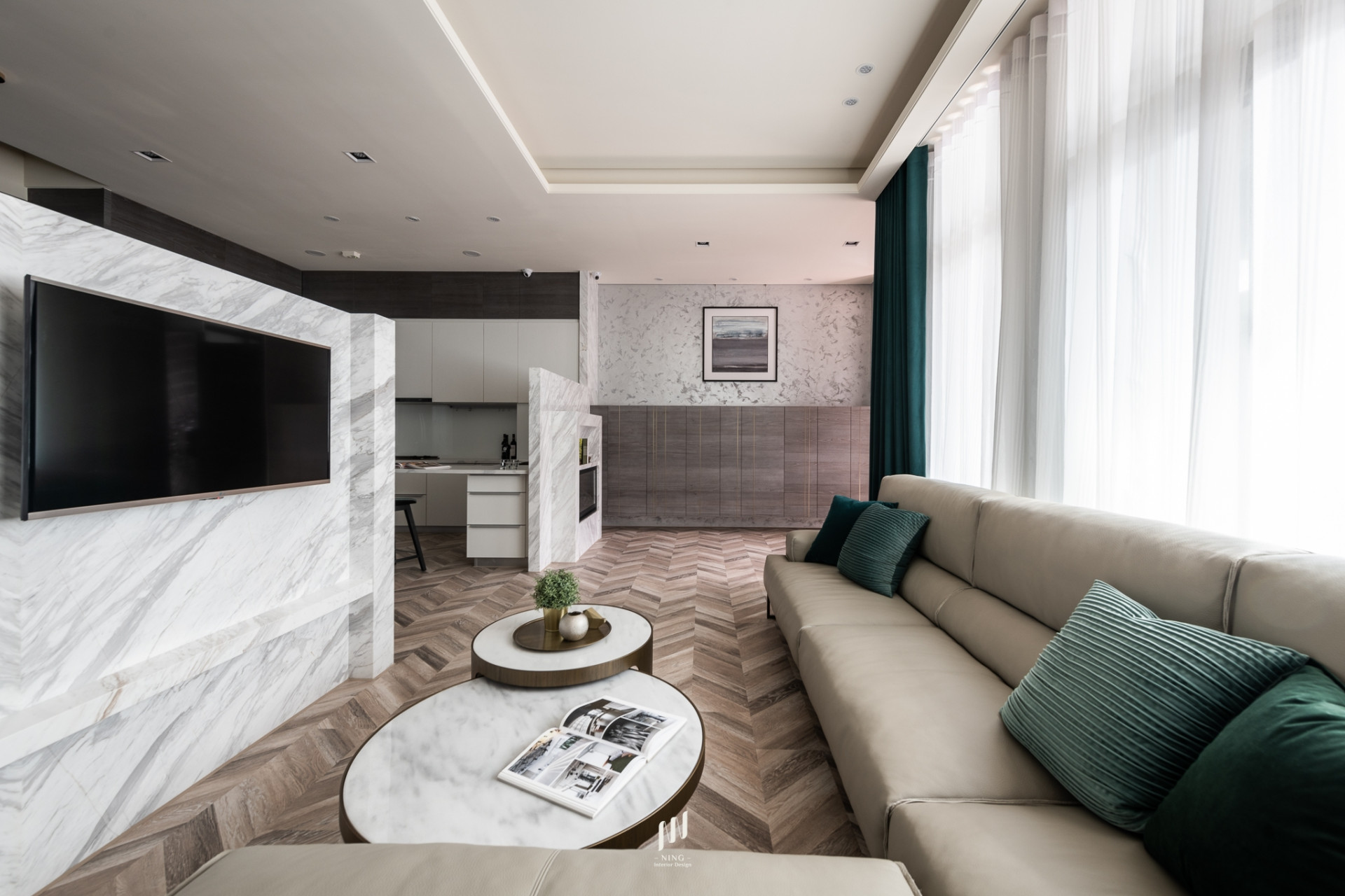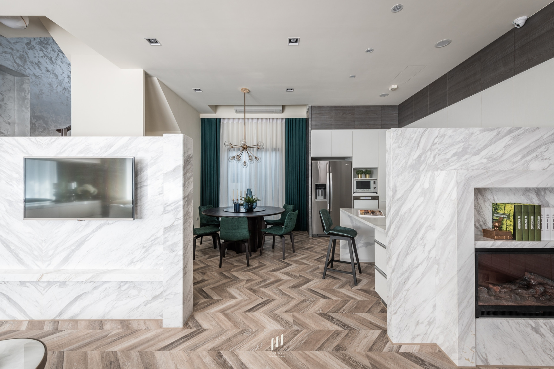 在城市的喧囂裡,這個家以大理石的紋理寫下靜謐章節,人字拼木鋪陳生活的溫度。墨綠與灰白交織,如同一首低吟的樂曲,讓日常在優雅與沉穩中緩緩展開。