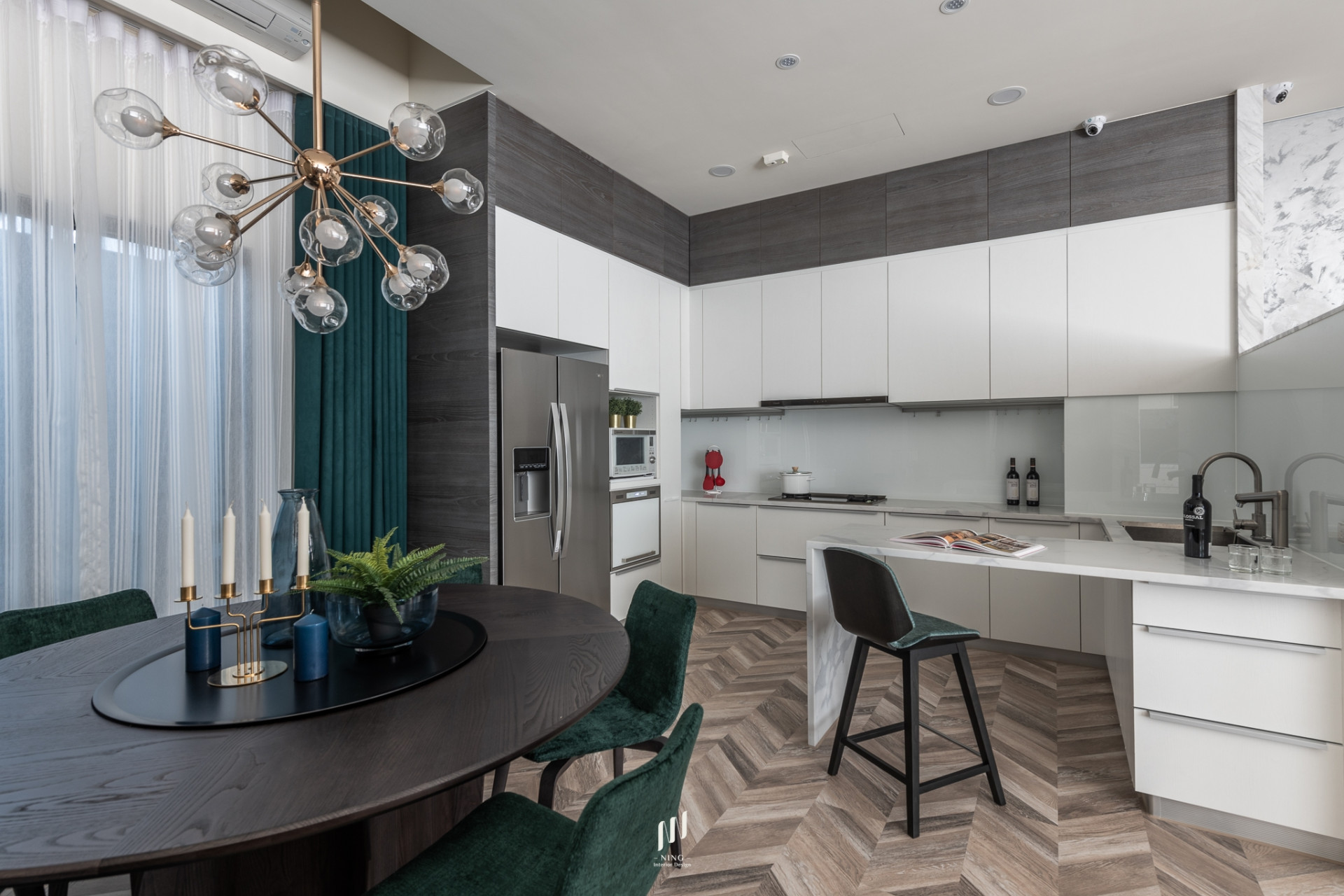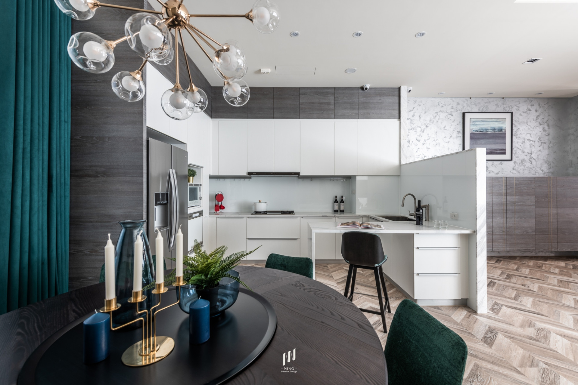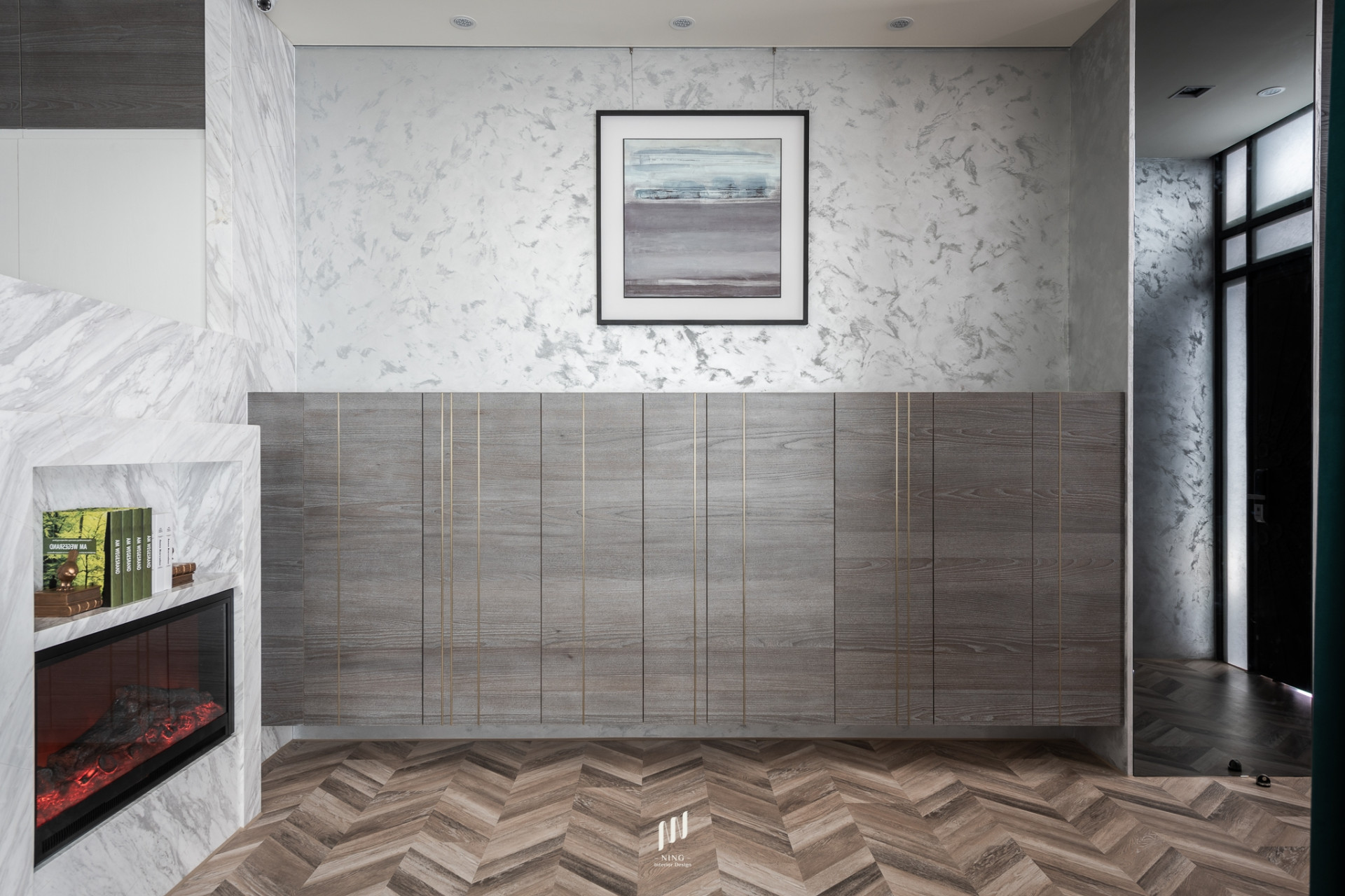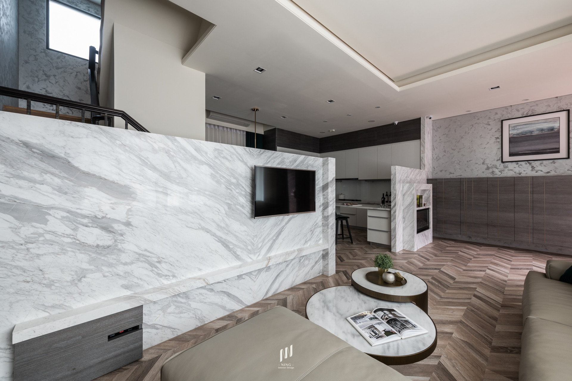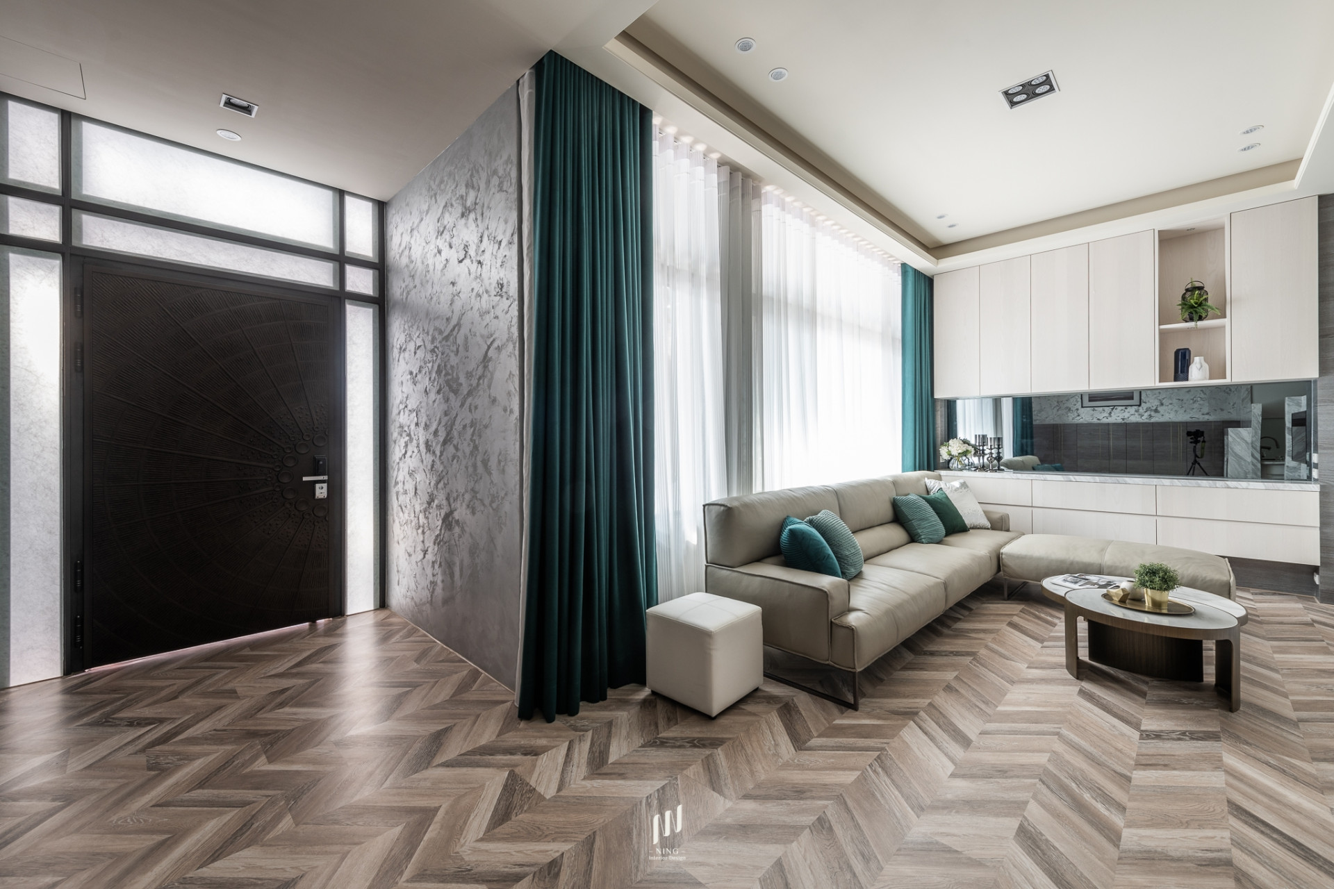 在城市的喧囂裡,這個家以大理石的紋理寫下靜謐章節,人字拼木鋪陳生活的溫度。墨綠與灰白交織,如同一首低吟的樂曲,讓日常在優雅與沉穩中緩緩展開。