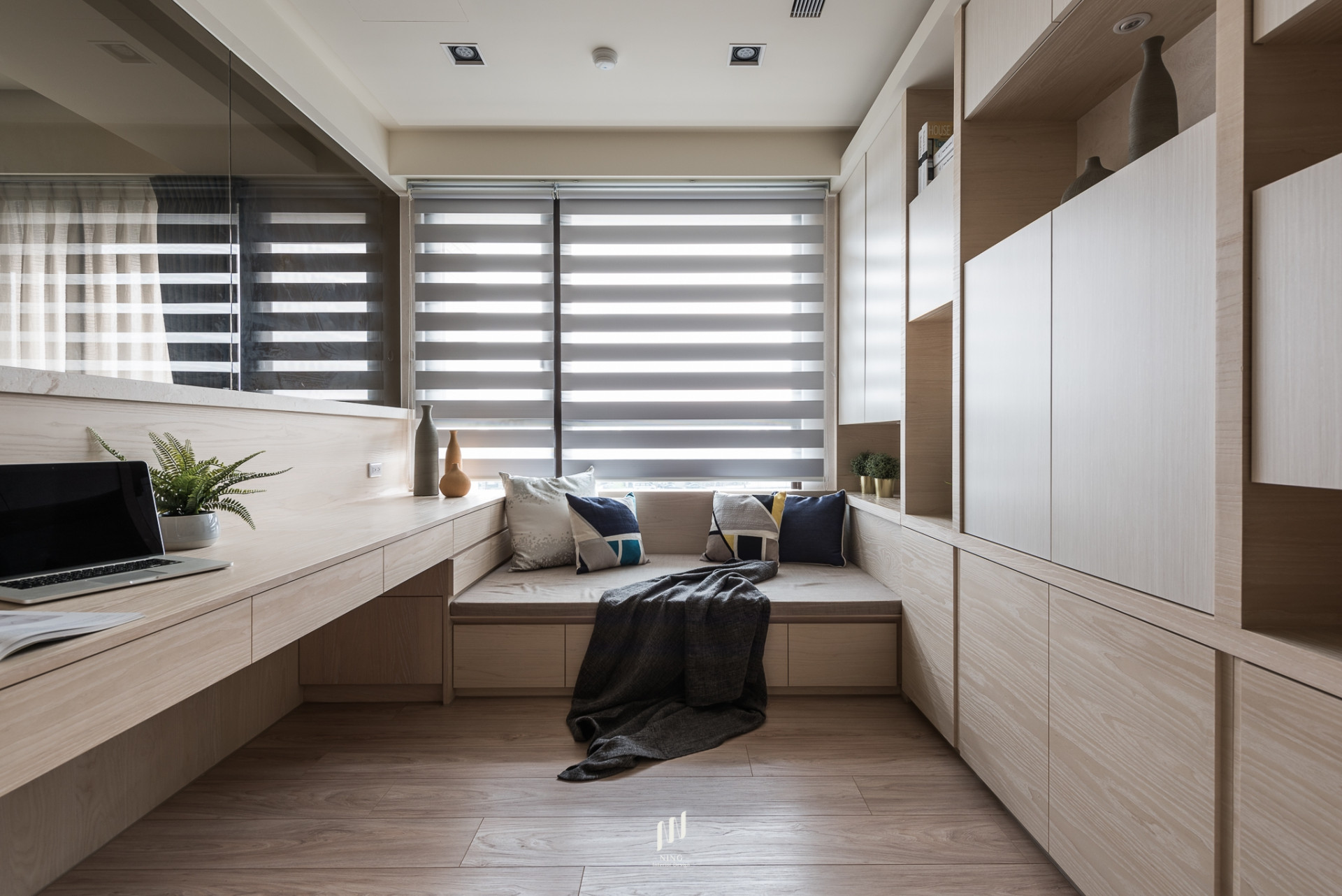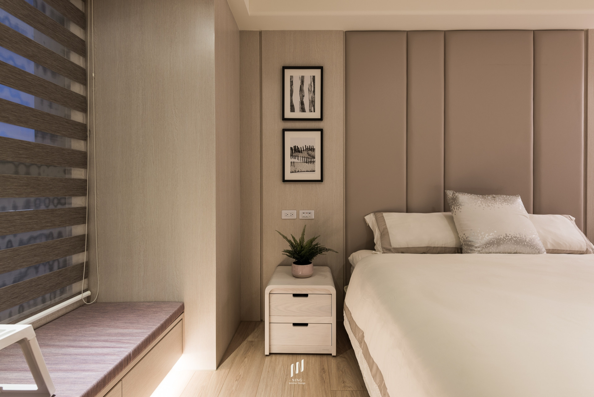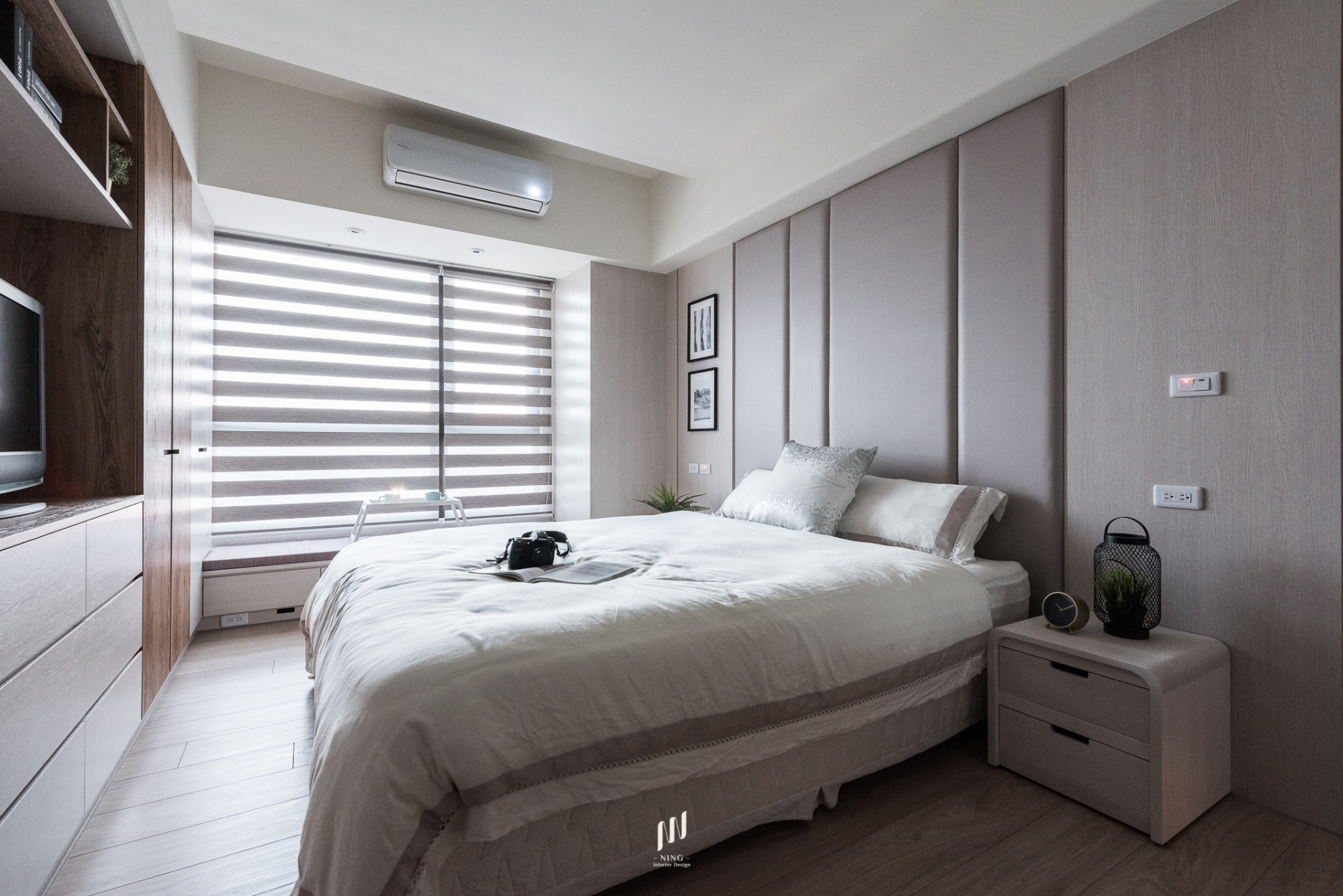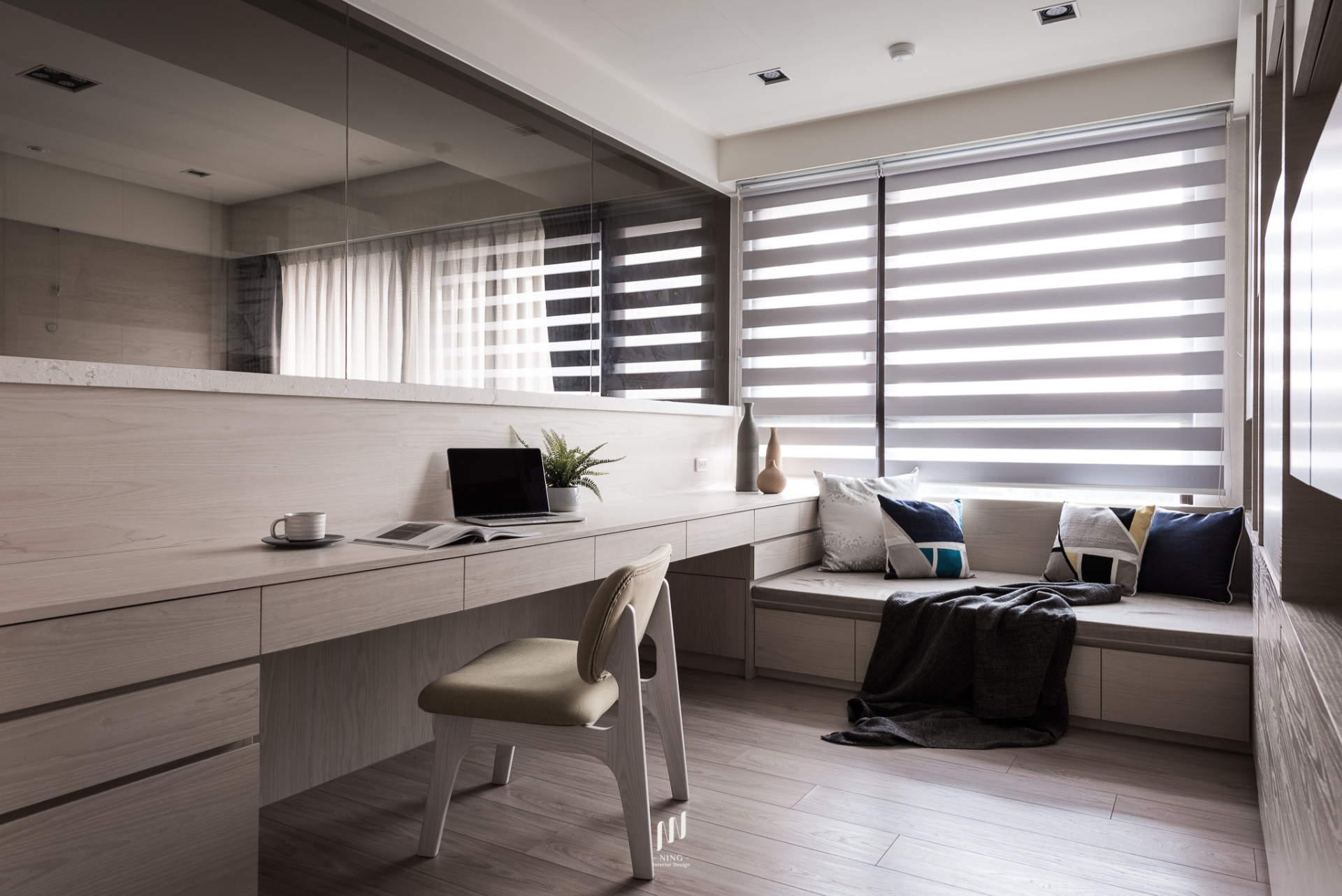 全室光線以雙層斑馬簾靈活調控,自然光灑落於溫潤木質中,帶來通透與寧靜。綠植與藝術品的點綴,讓空間兼具生活感與人文氣息。此設計回歸「家」的本質,在簡約俐落中,映照出日常的溫暖與質感。