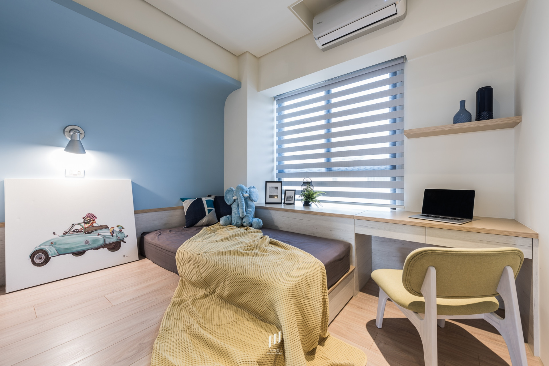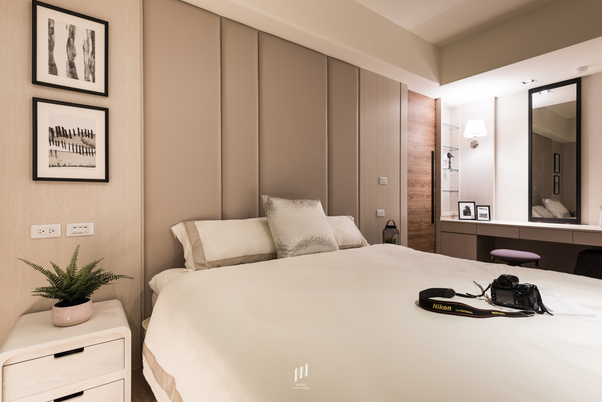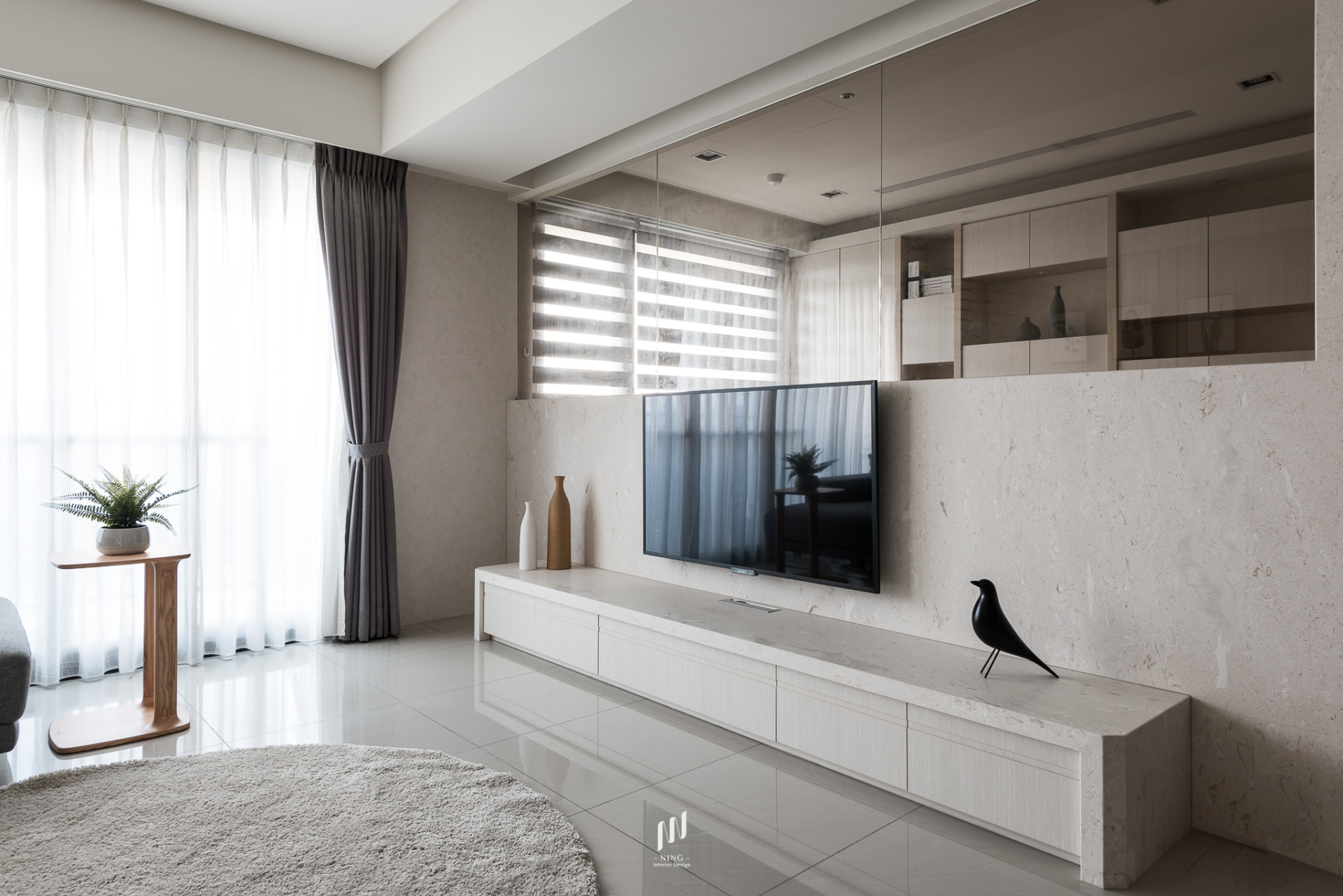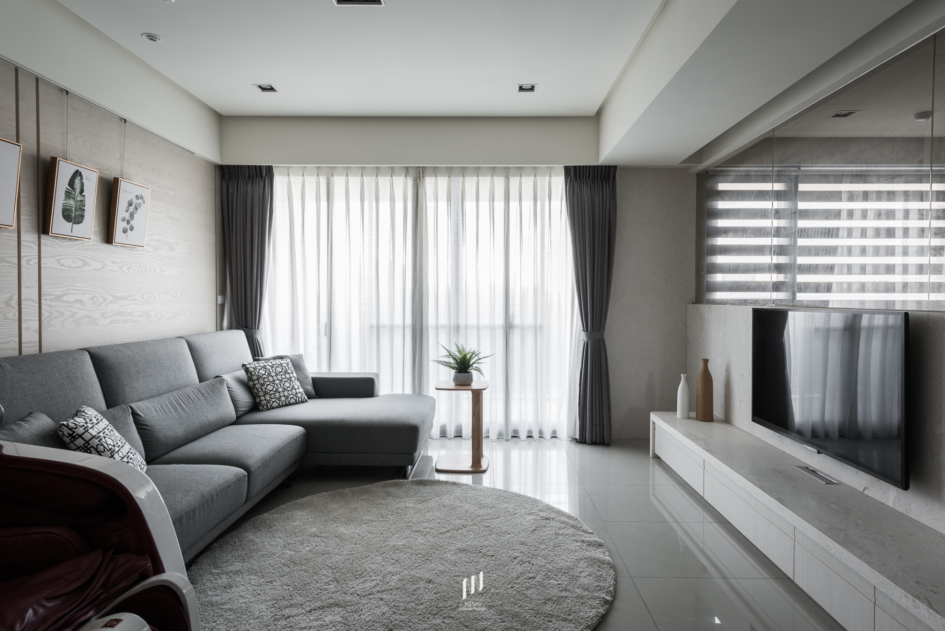 全室光線以雙層斑馬簾靈活調控,自然光灑落於溫潤木質中,帶來通透與寧靜。綠植與藝術品的點綴,讓空間兼具生活感與人文氣息。此設計回歸「家」的本質,在簡約俐落中,映照出日常的溫暖與質感。