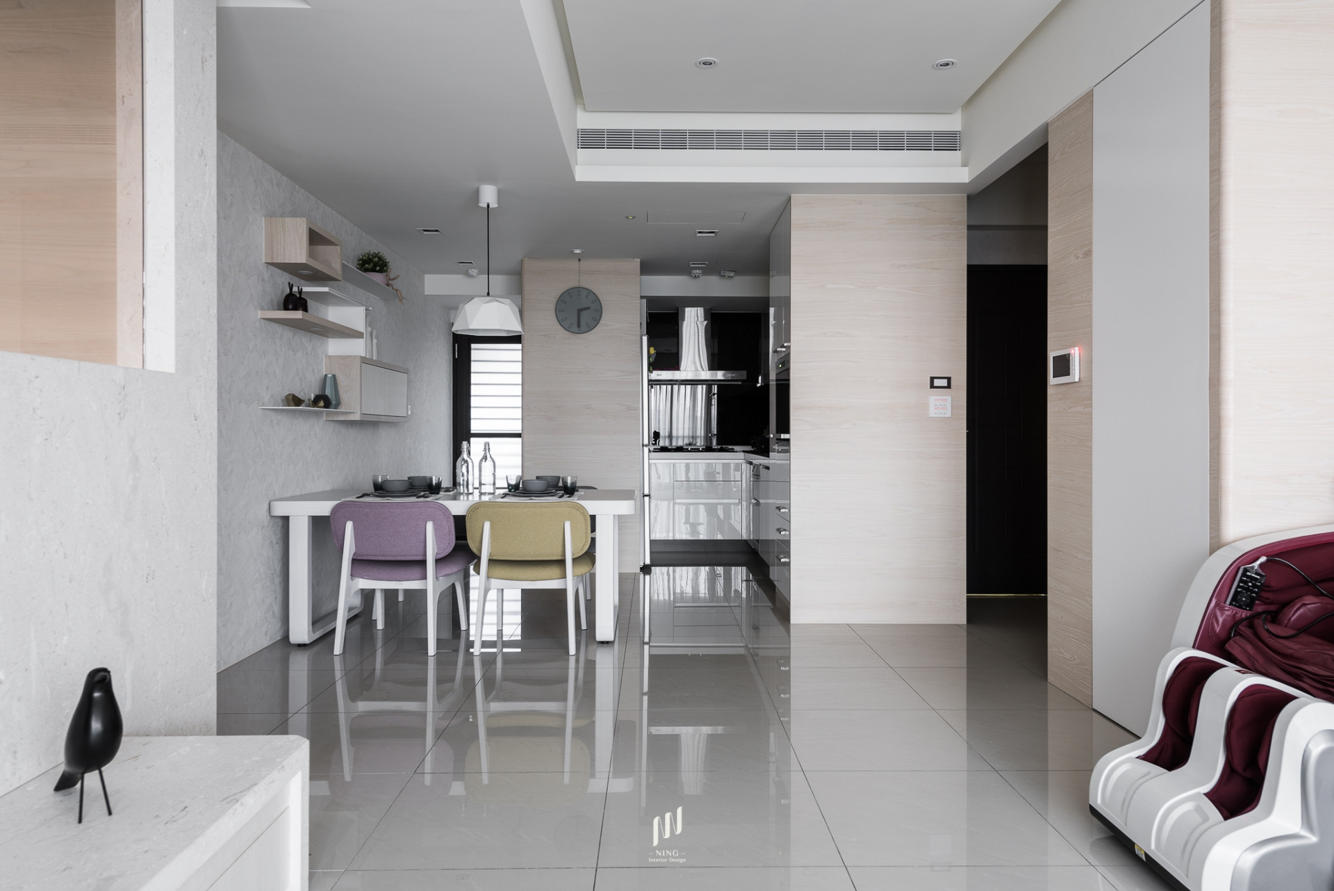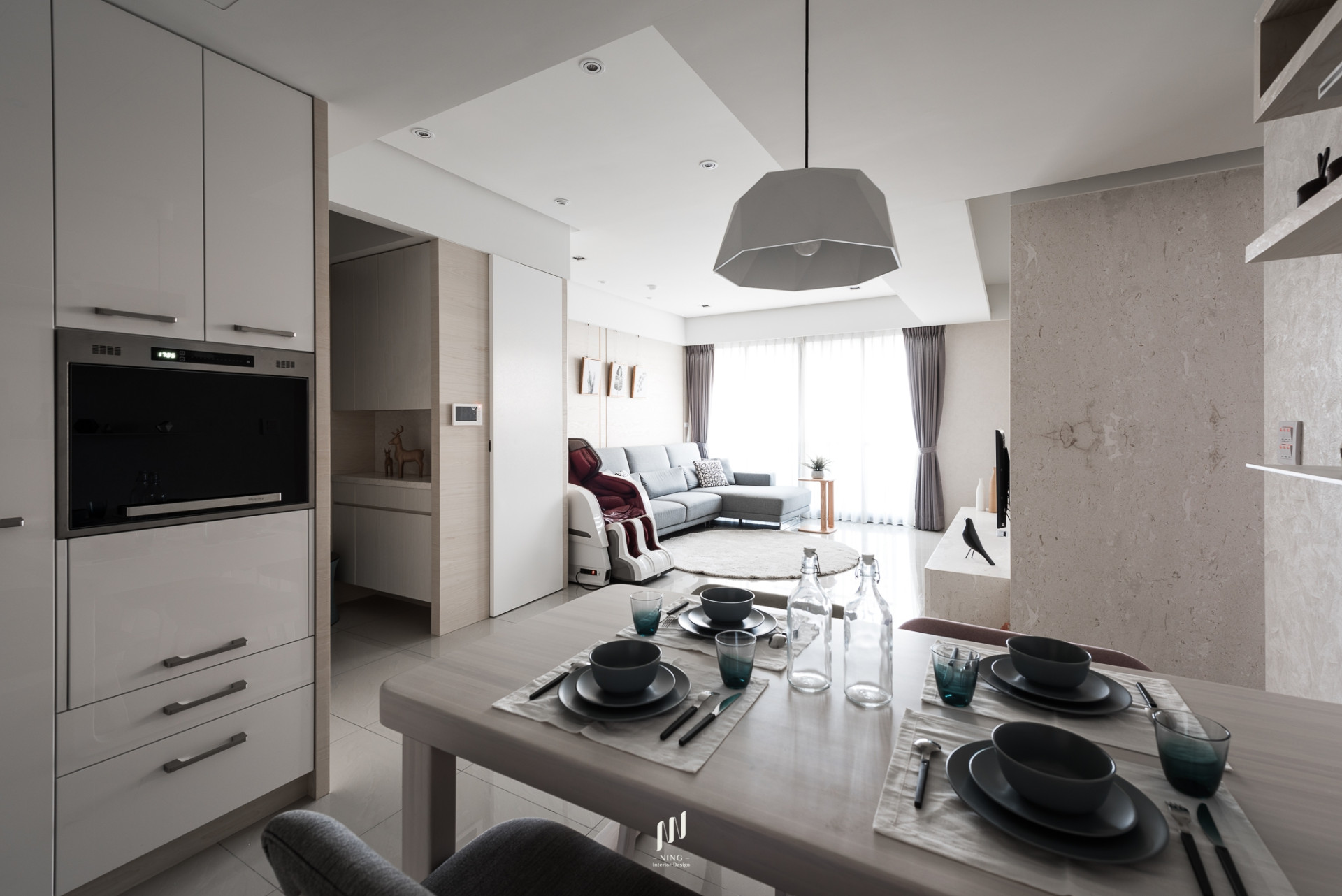 本案以「現代簡約 × 北歐自然感」為設計核心,透過大面積木質元素與中性色彩鋪陳,營造溫潤而舒適的居家氛圍。公共空間以米白、灰階與淺木色為基調,搭配石材電視牆與隱藏式收納,呈現俐落且具質感的生活場景。
