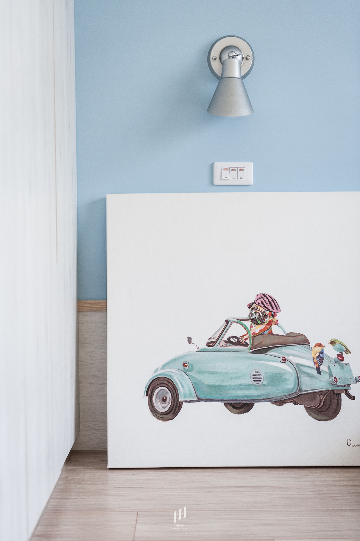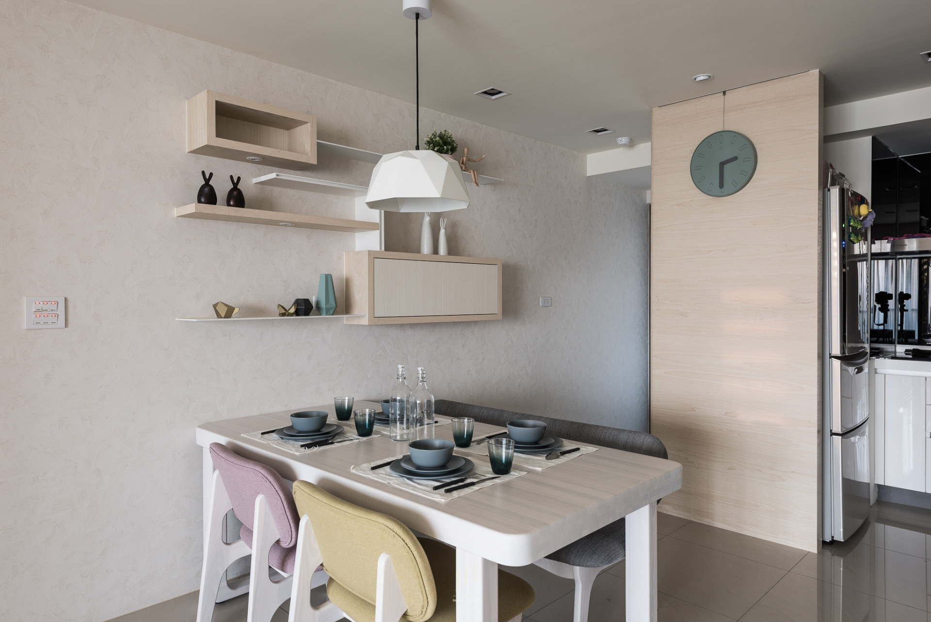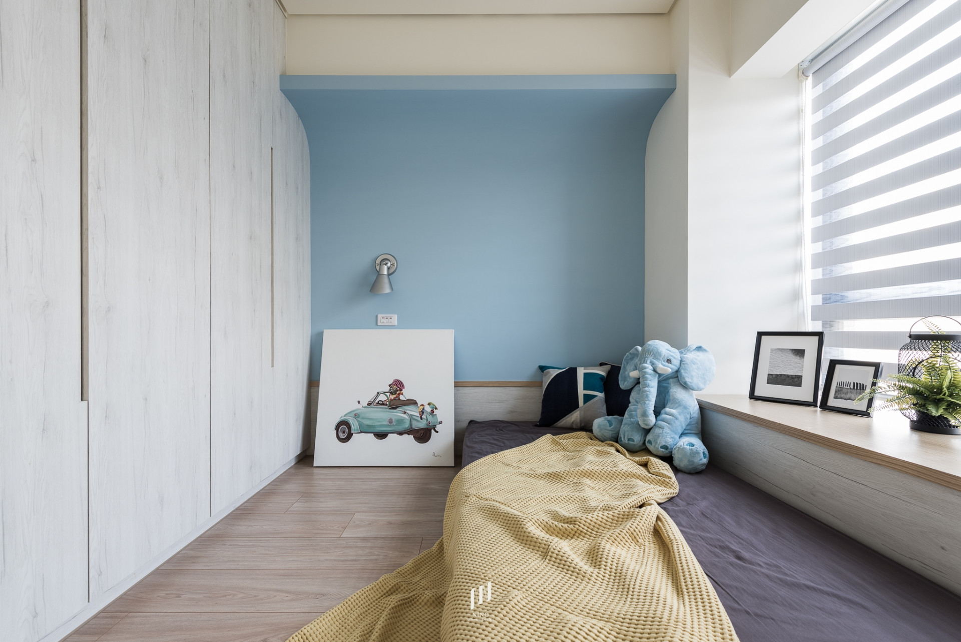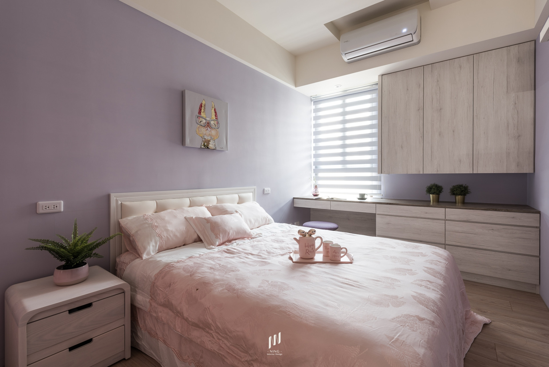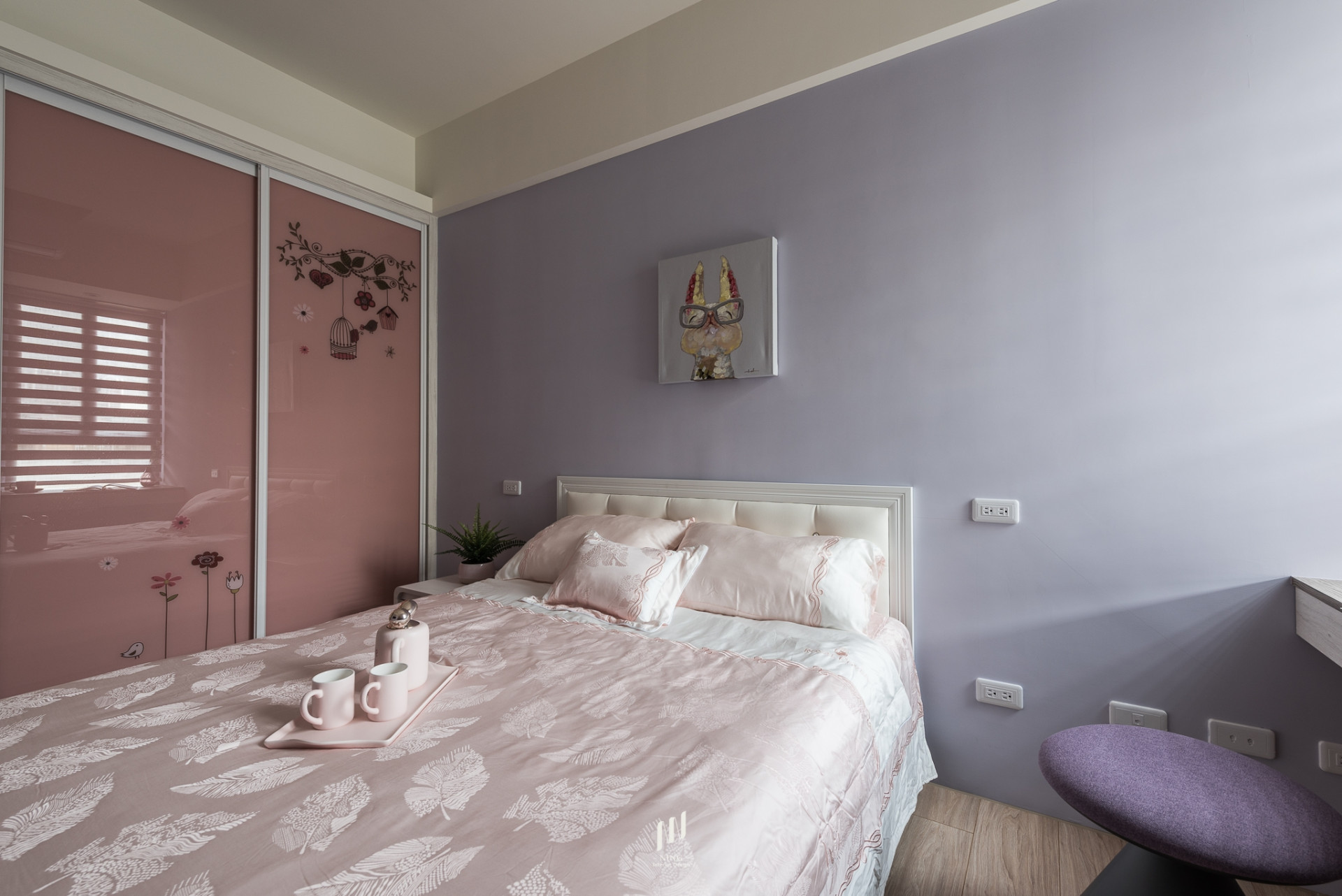 書房兼具多功能用途,結合長型書桌與臥榻設計,既能辦公閱讀,也能轉化為休憩角落;開放展示與隱藏收納的平衡,使空間實用而不失美感。臥室則依居住成員特質,透過不同色彩語彙塑造專屬氛圍:主臥以灰棕色軟包床頭創造靜謐安定感,次臥分別以粉紫與淡藍牆面搭配童趣畫作與柔和家飾,展現輕盈與活潑。