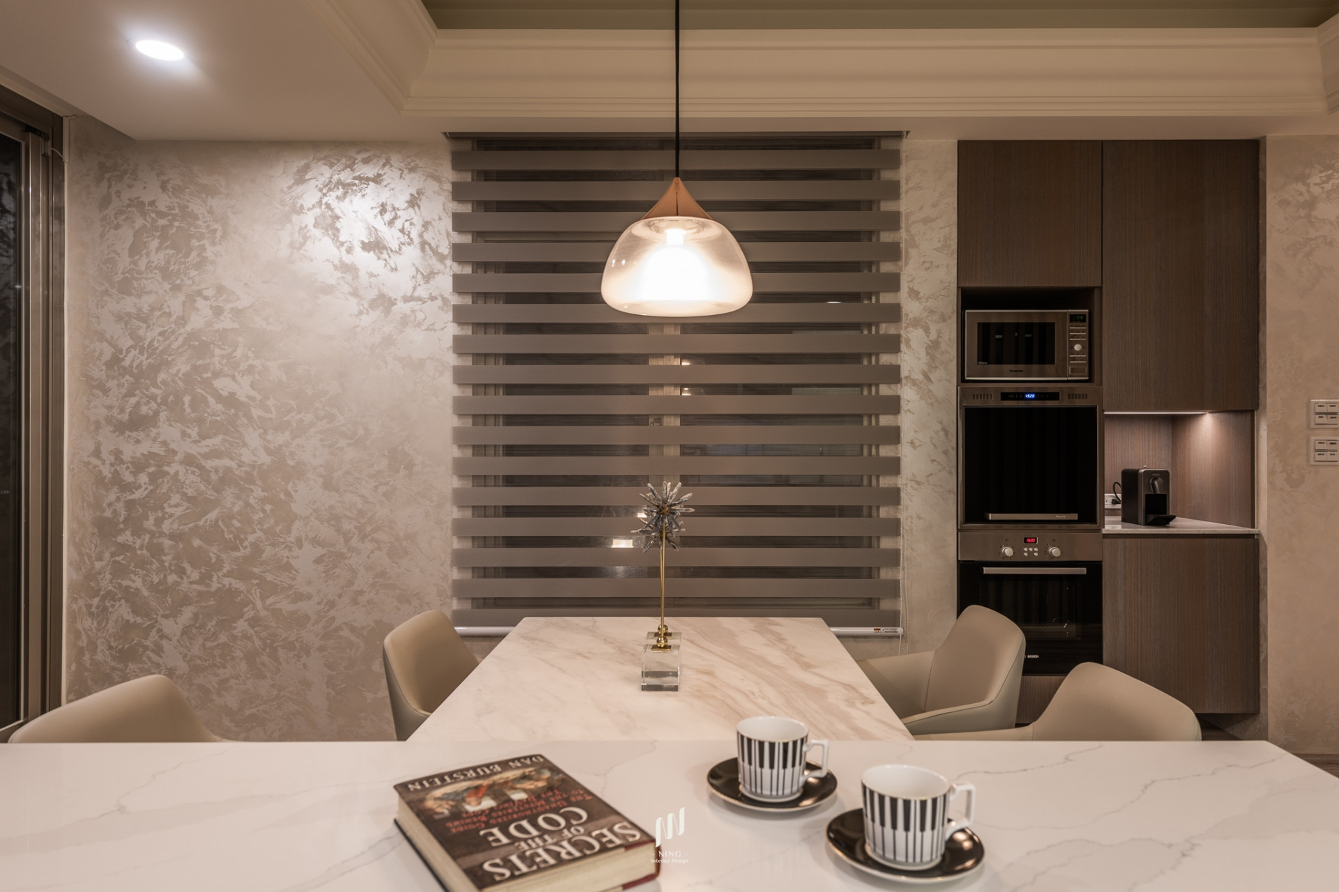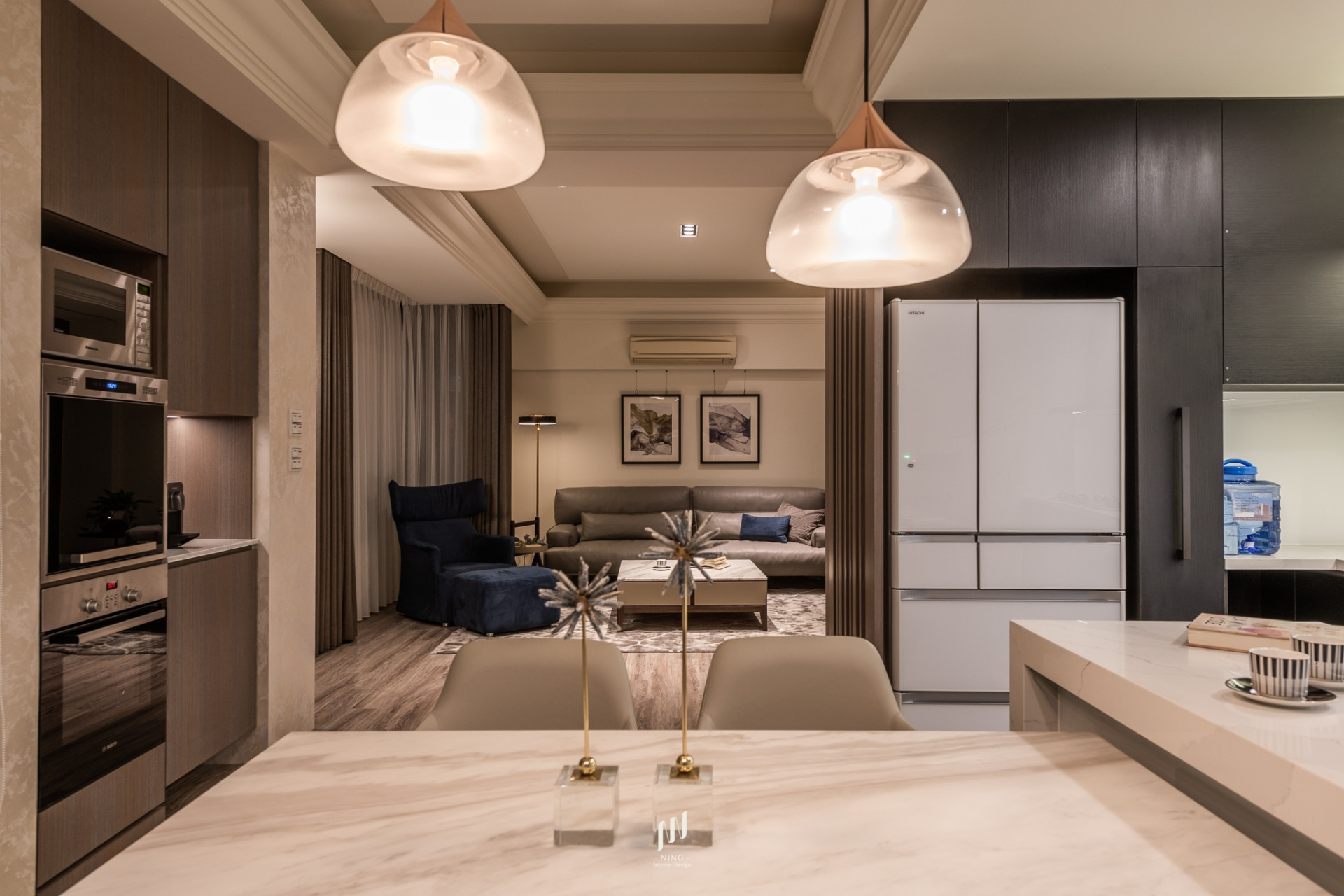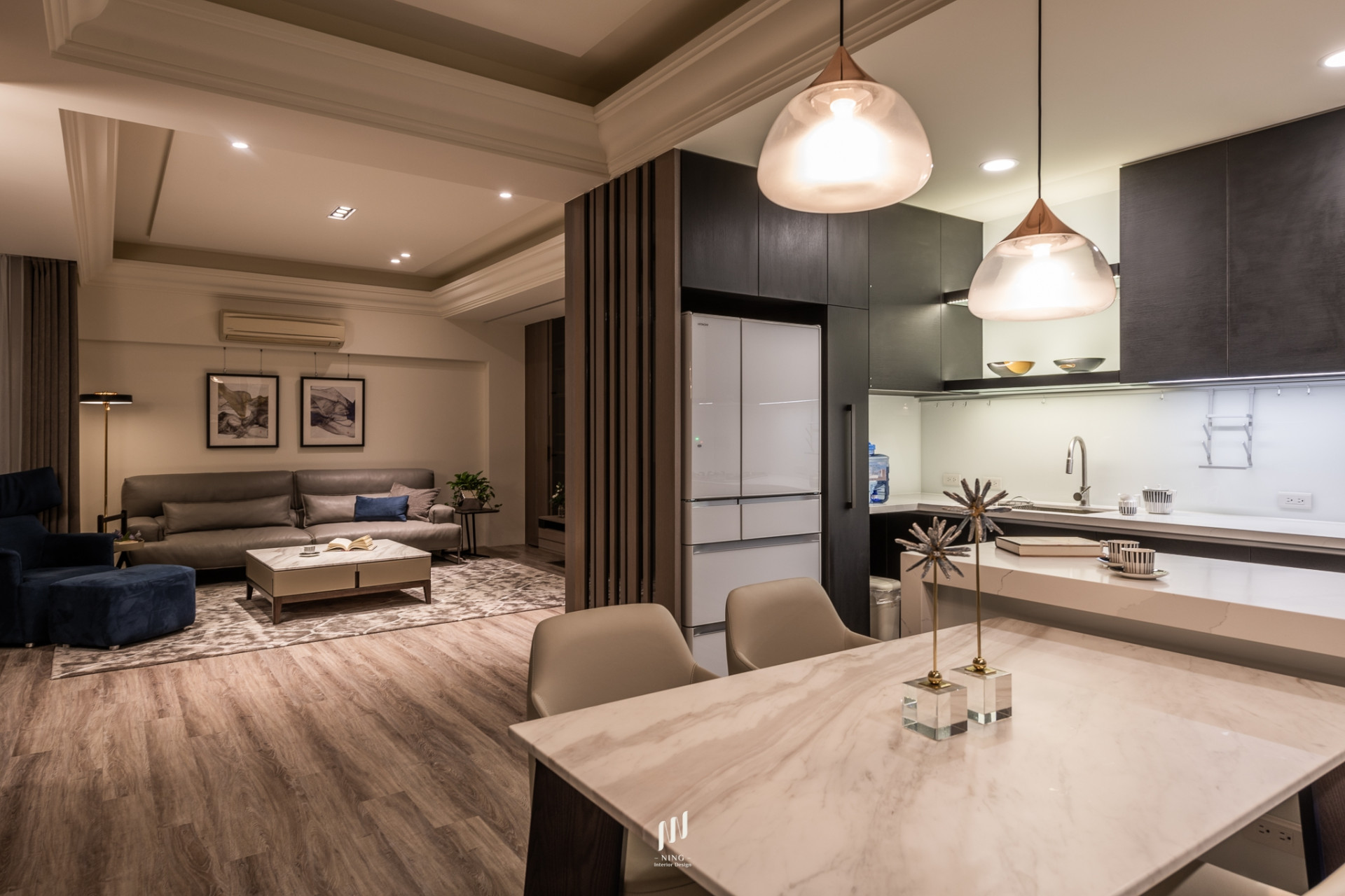 客廳以簡約線條隱藏收納,餐廳以石材與燈光營造溫潤氛圍。