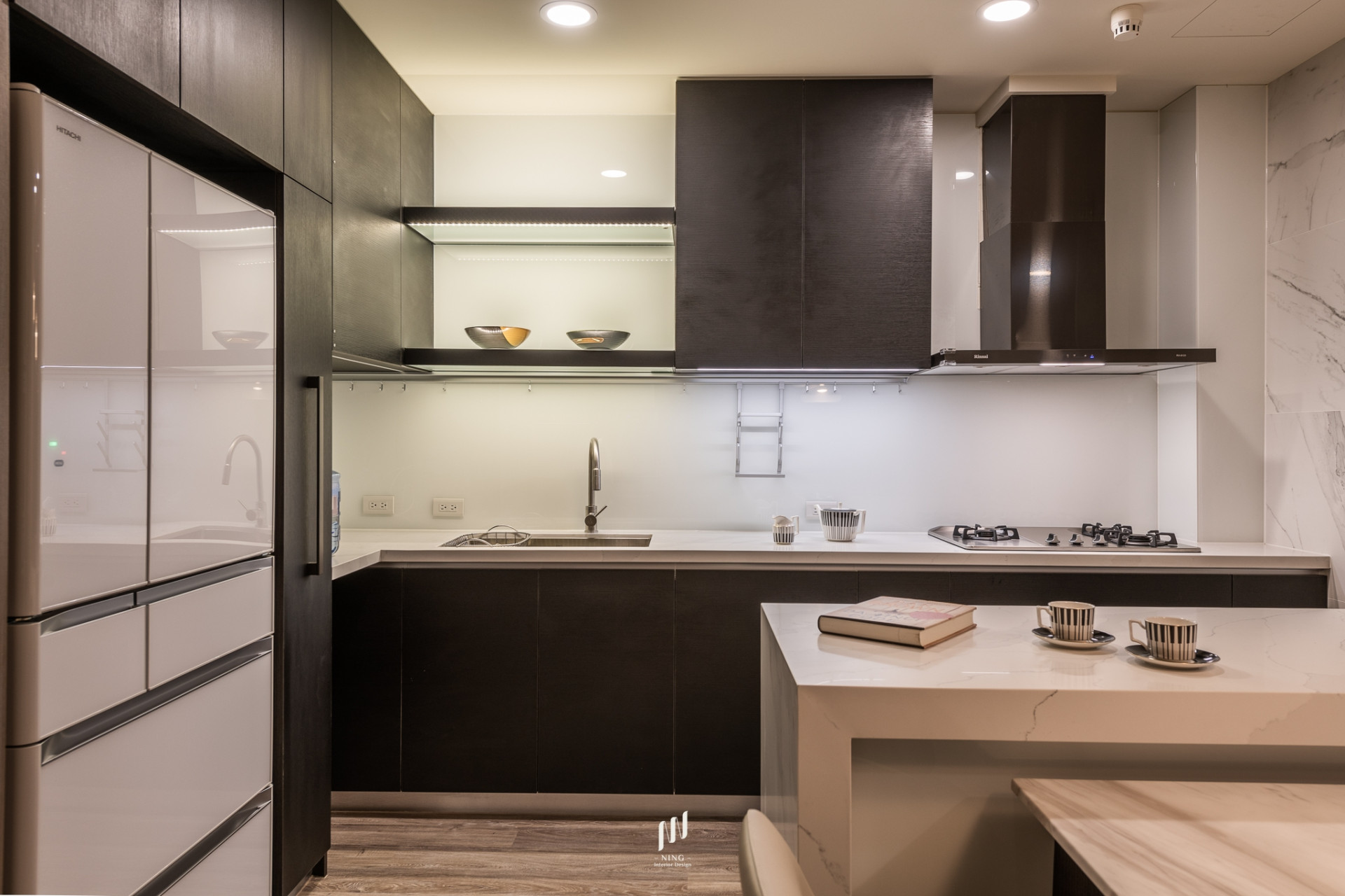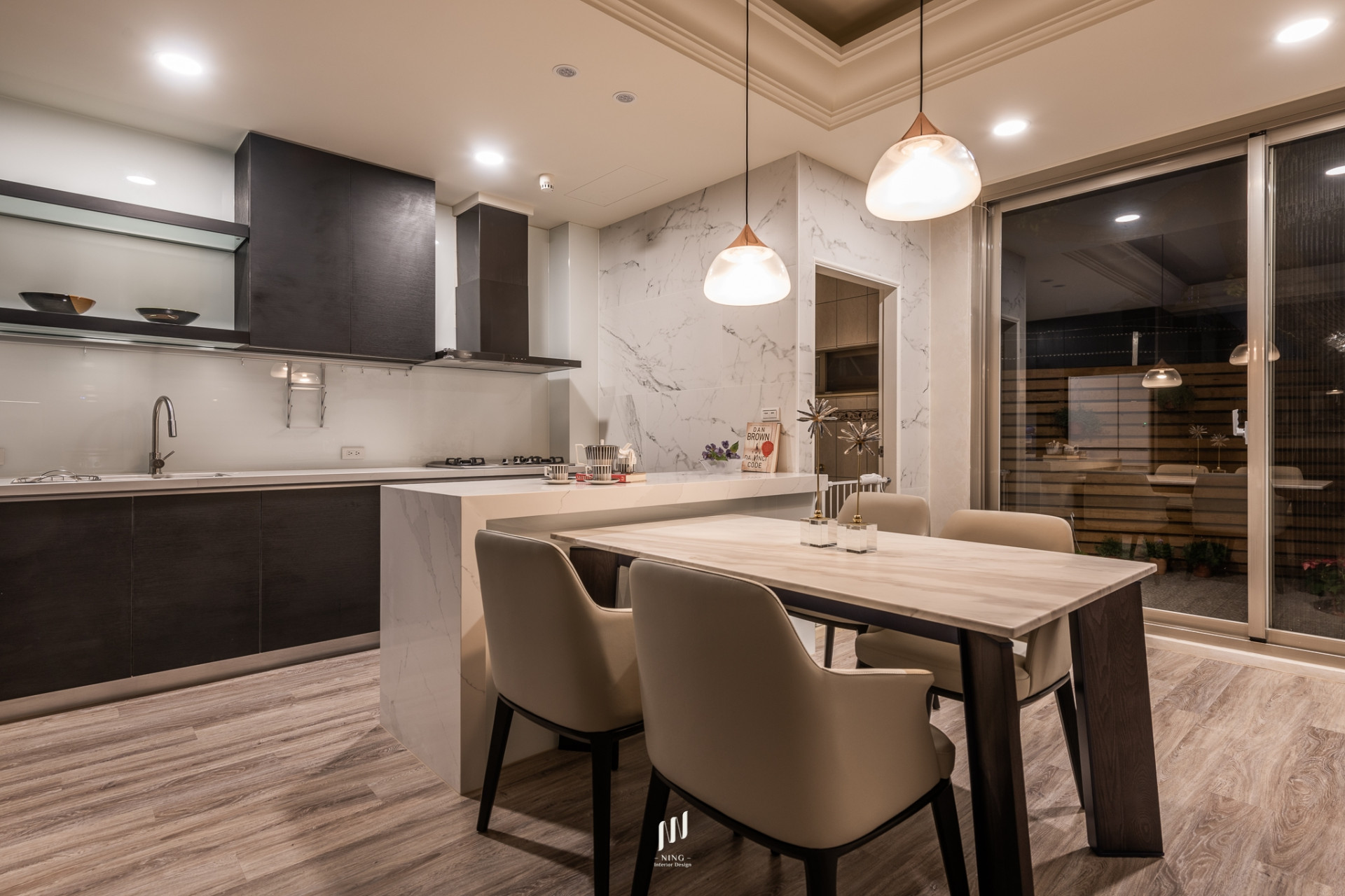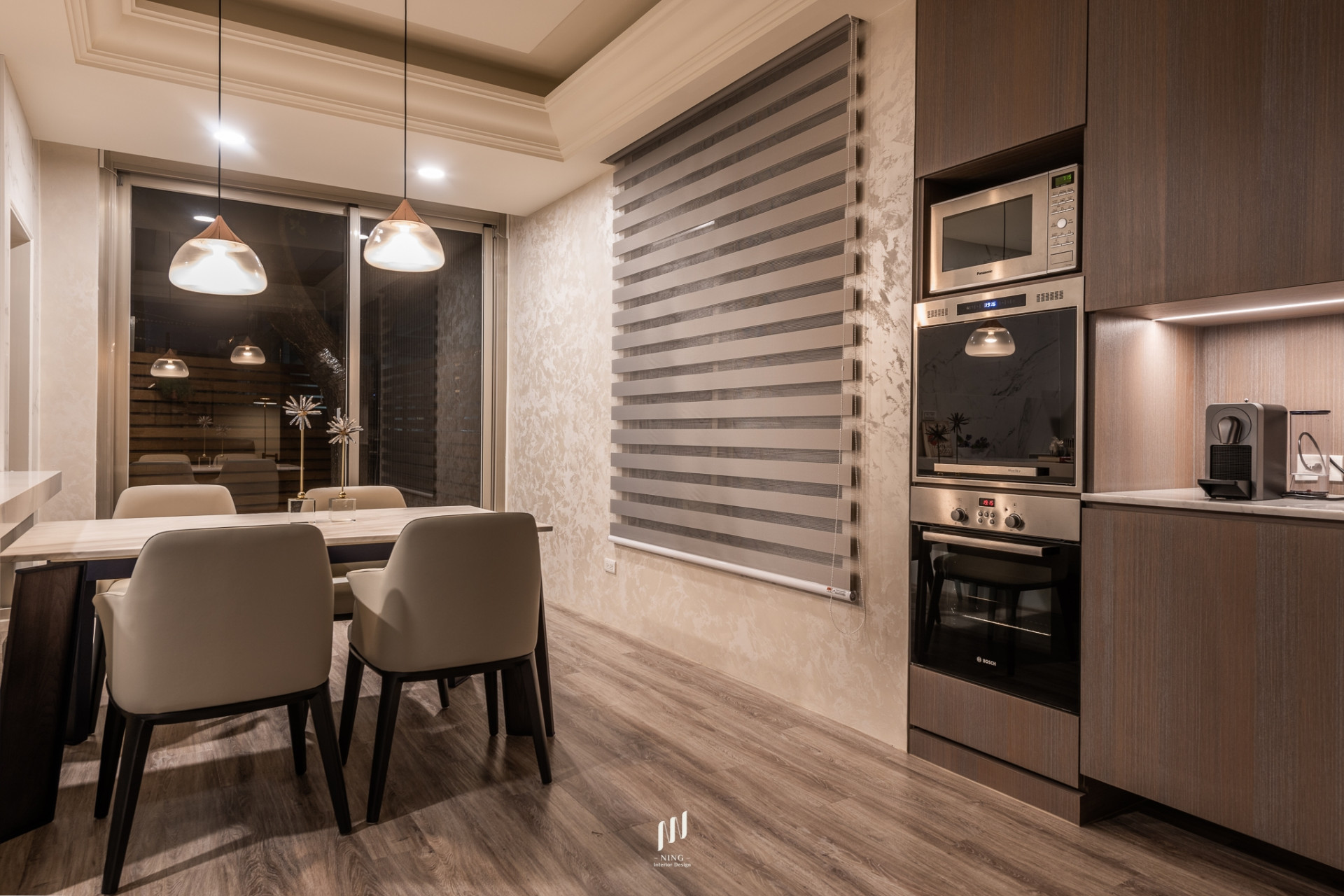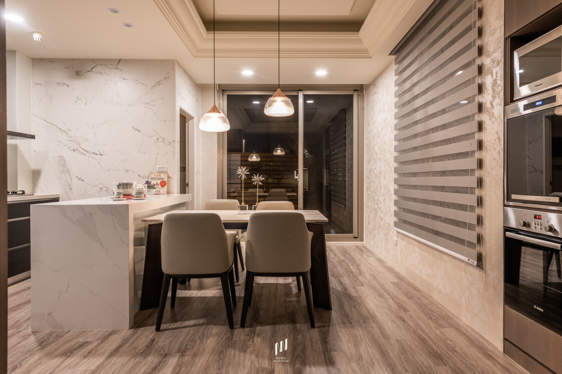 客廳以簡約線條隱藏收納,餐廳以石材與燈光營造溫潤氛圍。