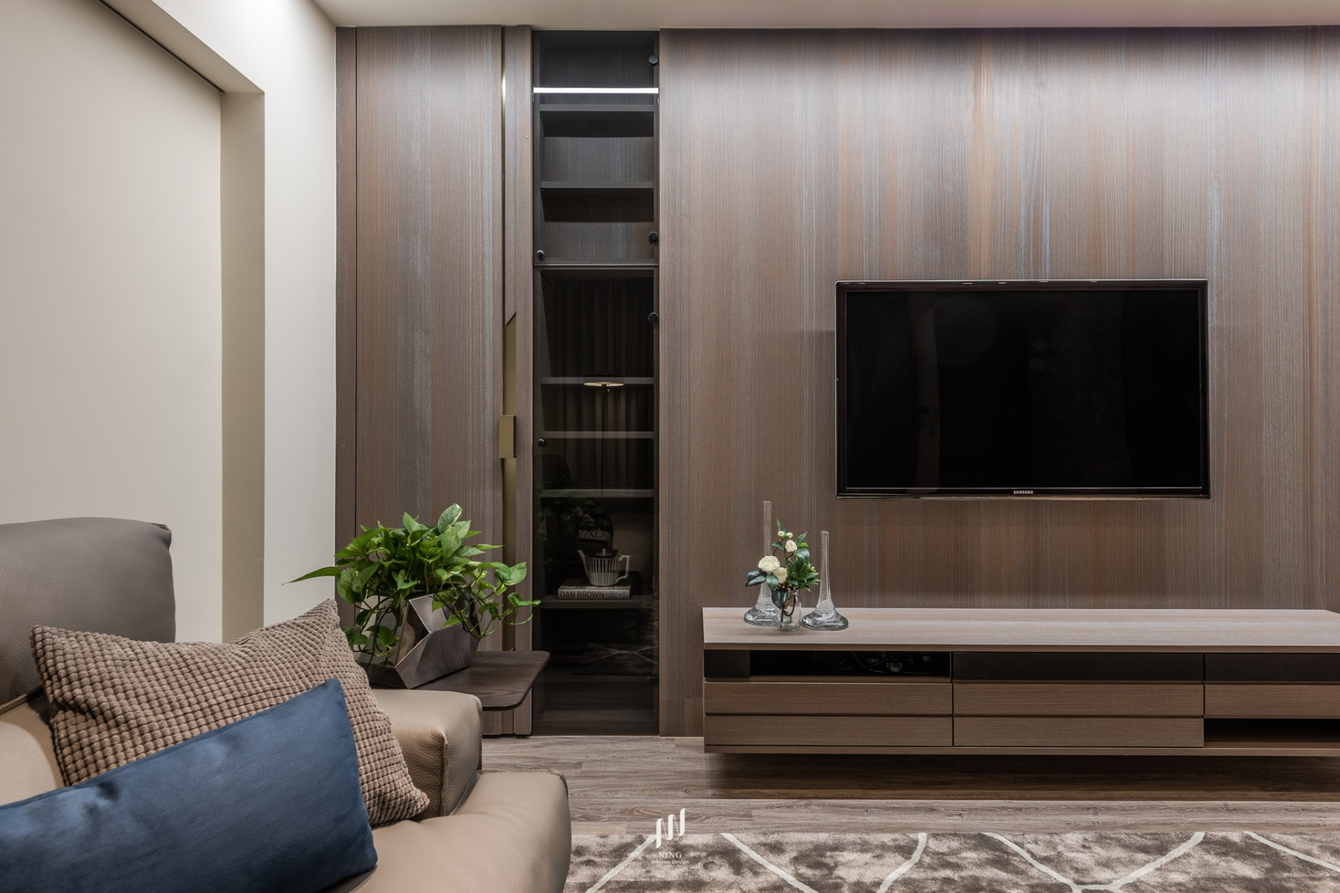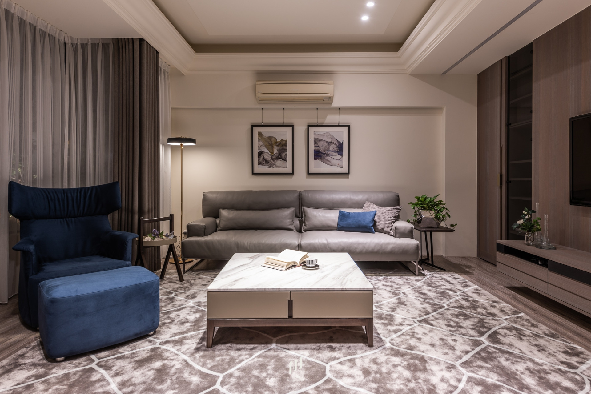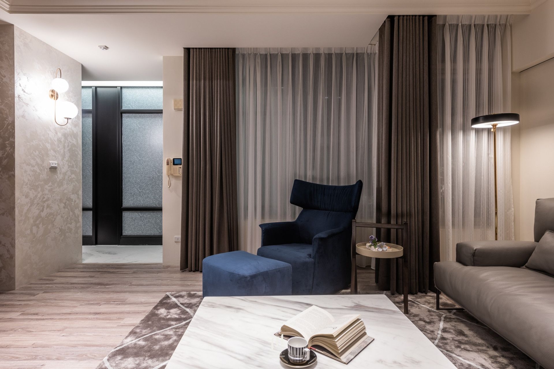 灰沙發與藍單椅對比出層次,細節藏著主人的品味。