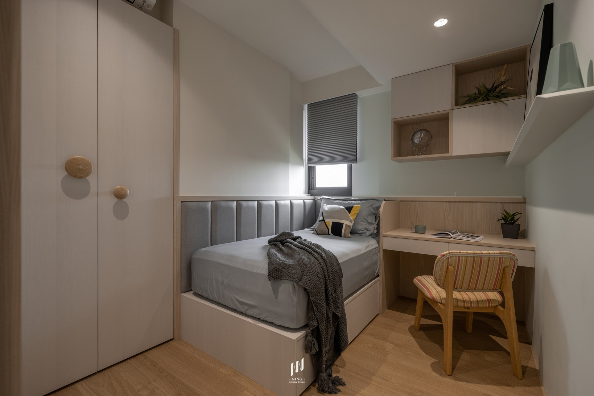 小孩房的設計則又是設計師面臨的另一挑戰。這空間不僅要滿足兩個小孩的不同需求,更要兼顧坪數的限制。