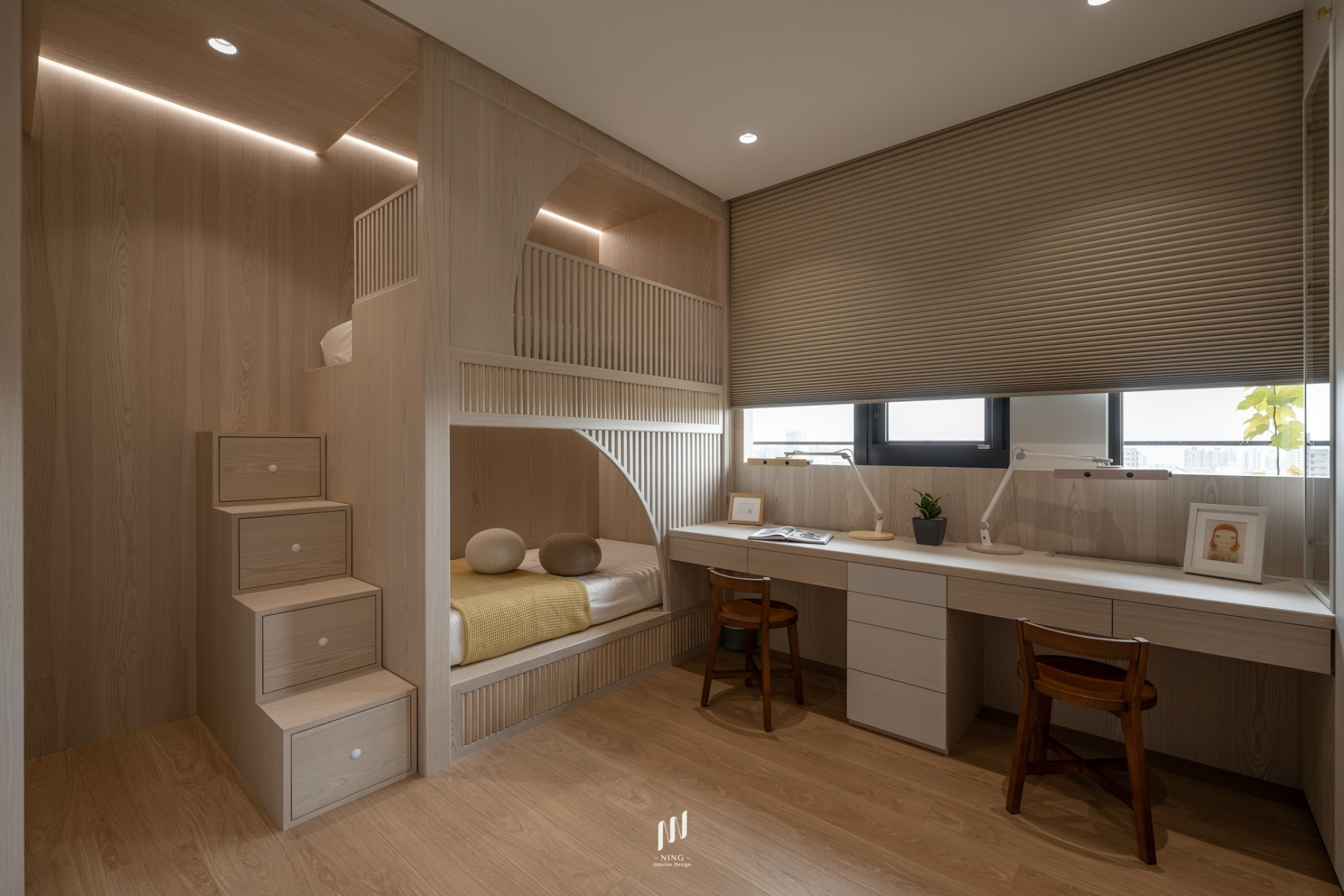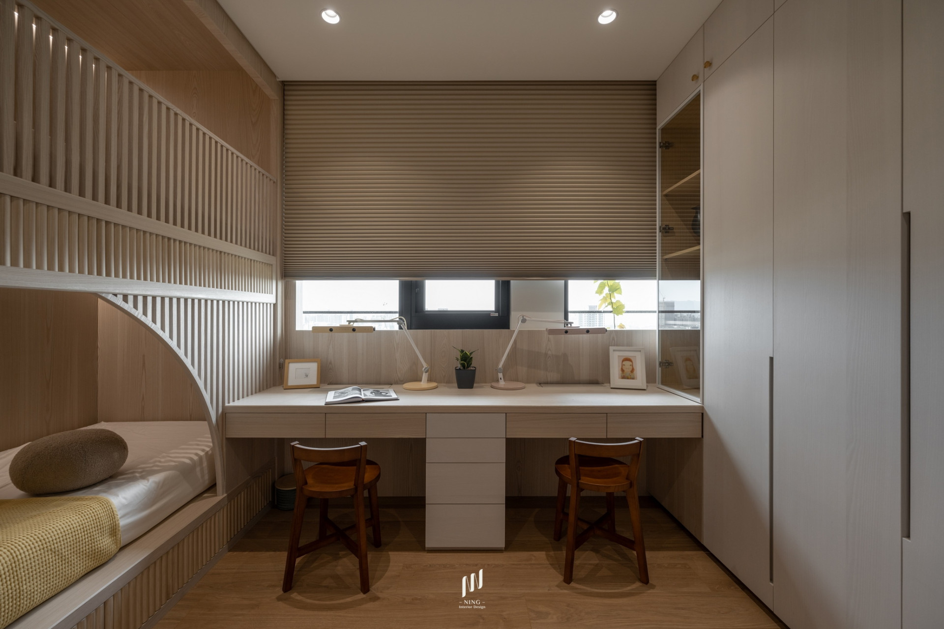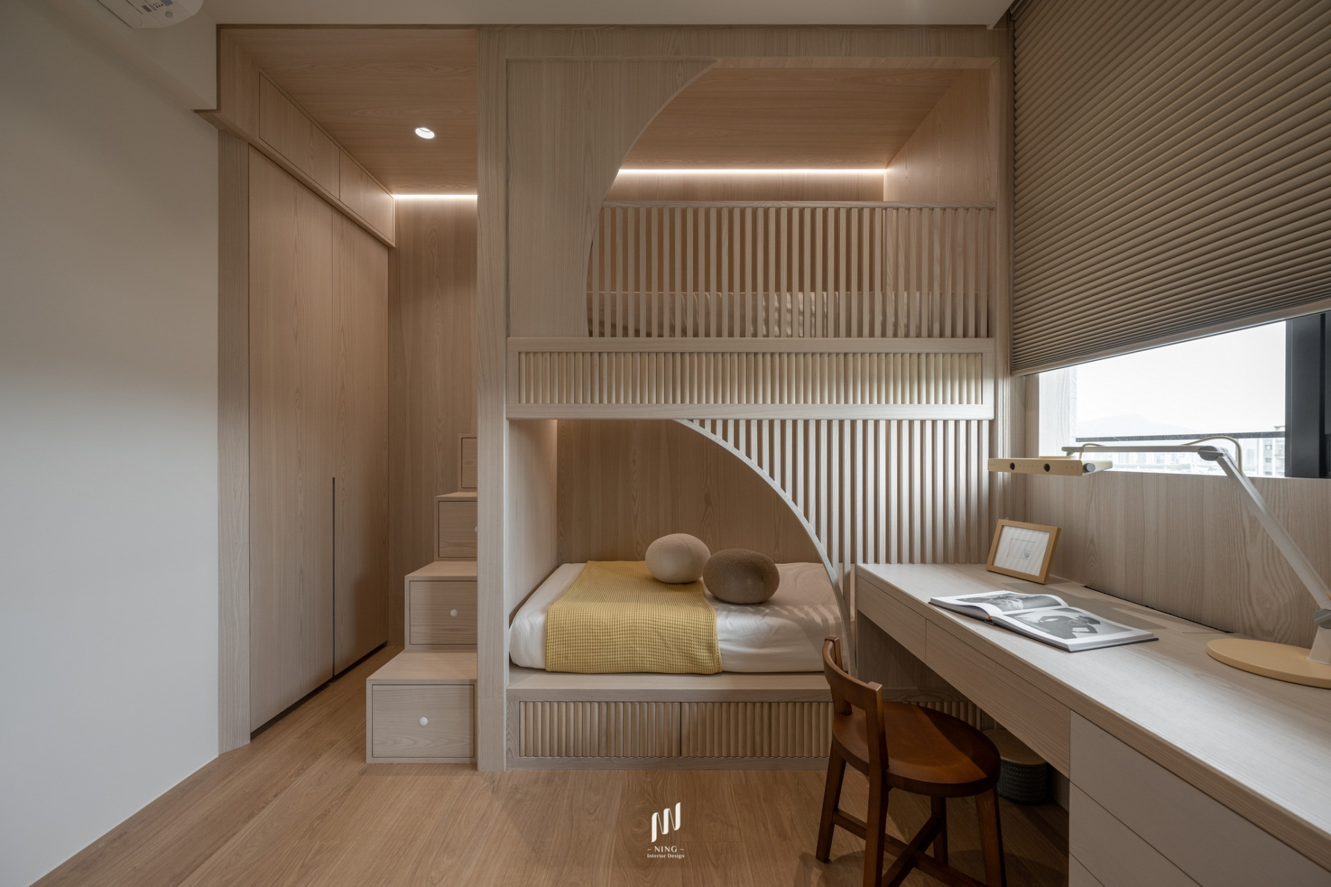 為了確保兩人休息、讀書不受影響,讀書讀累了還可以看向窗外休息一下.設計團隊最終決定打造一間充滿原木感的上下舖房間,營造寬敞而不壓迫的氛圍,上舖床邊的鏤空造型增加了視覺層次,而天花板的凹陷則提高了整體空間的高度,有效減緩了上層的壓迫感。
