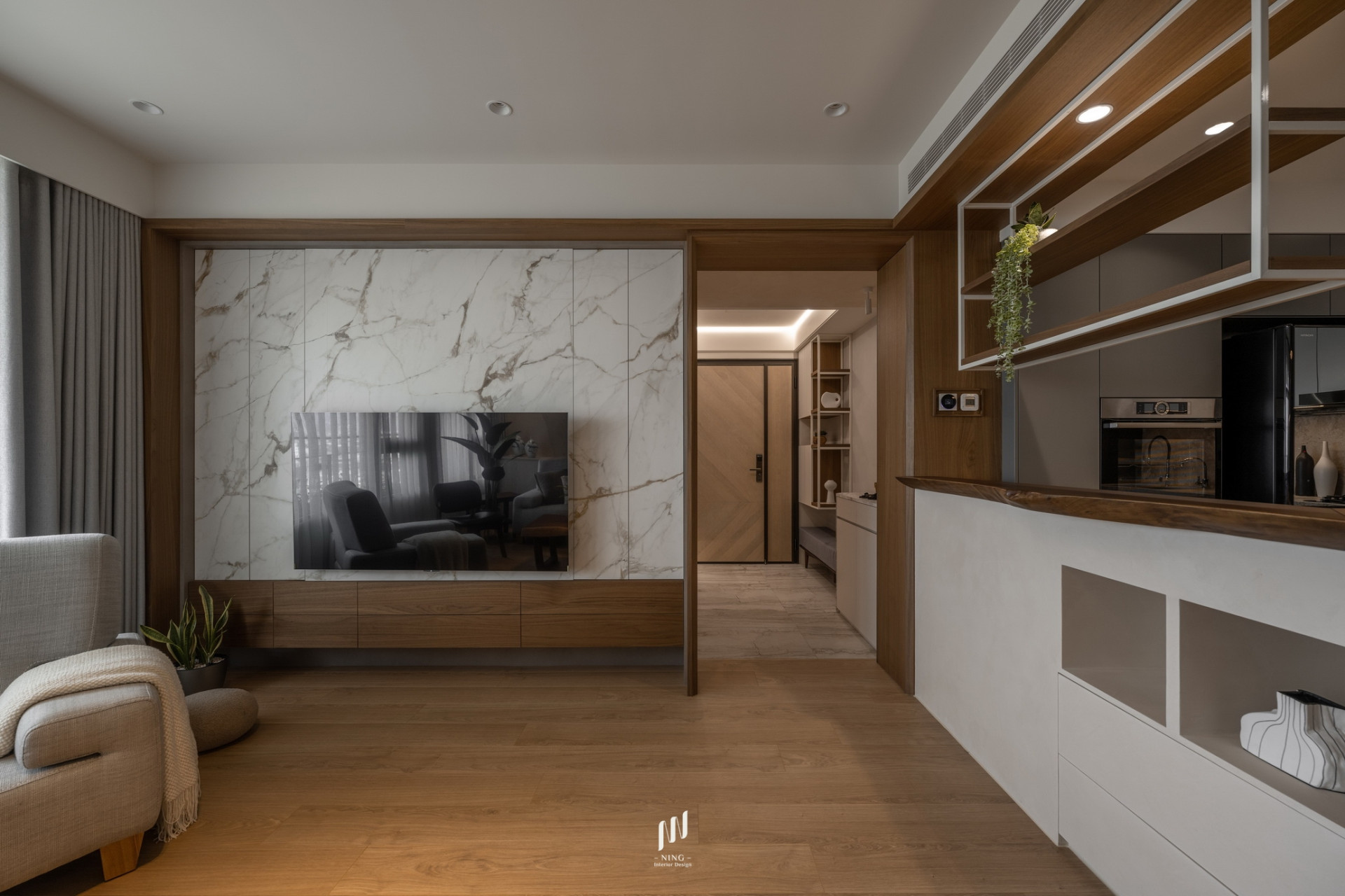 例如玄關的櫃架設計就不僅為業主提供充足收納,更巧妙展示了業主熱愛的木雕藝品。客廳的設計採用了淺色和原色系的搭配,營造輕鬆愉悅的生活氛圍。電視牆的大板磚設計以其豐富多彩的紋理呈現出對花的藝術,營造了大器而優雅的感覺。同時,電視牆與沙發後方的櫃子也提供了豐富的儲物空間。