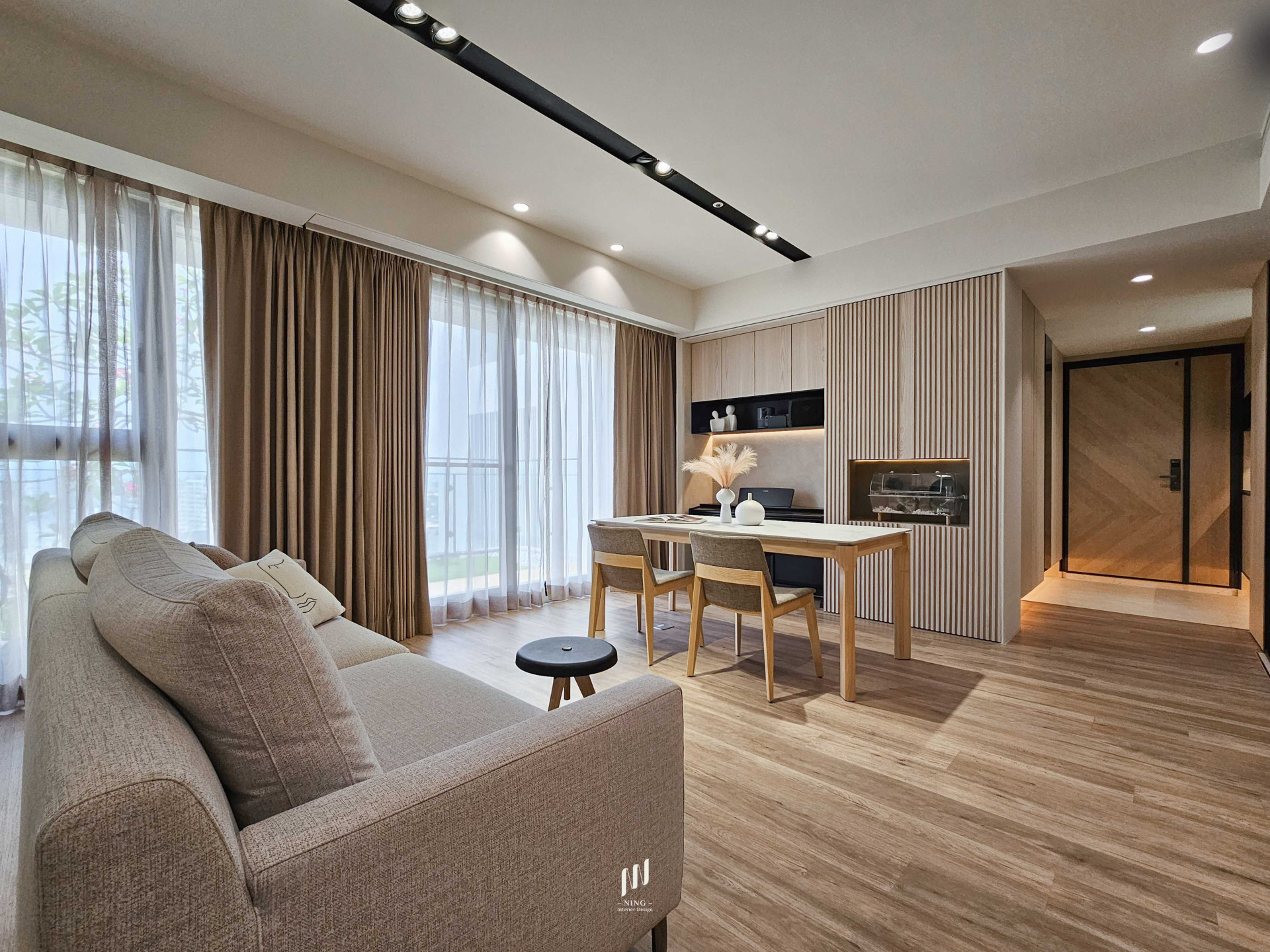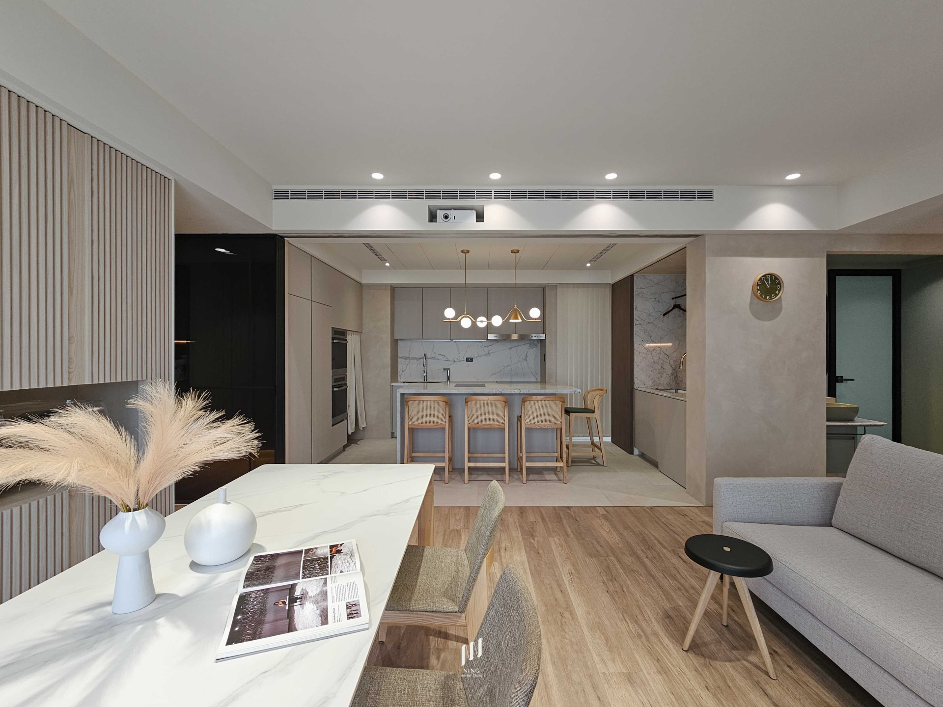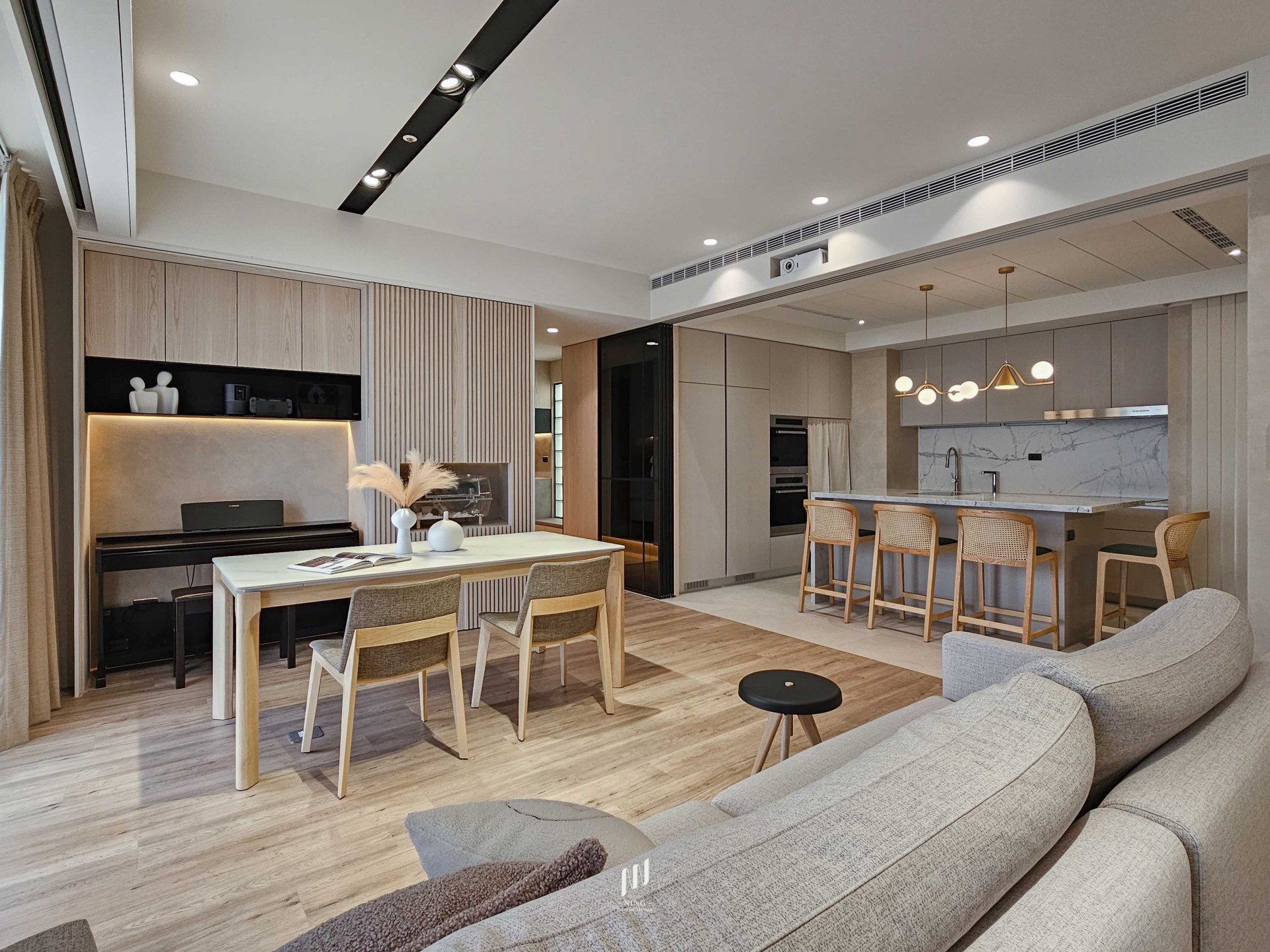 公共起居客廳為一個家的靈魂所在,特別將景場打造成極具動態感的空間,靈活可移動的家具為特色,特別配置的投影設備,讓一家人可以輕鬆地在此一同觀賞喜愛的電影,展現現代生活家庭娛樂的新風貌。