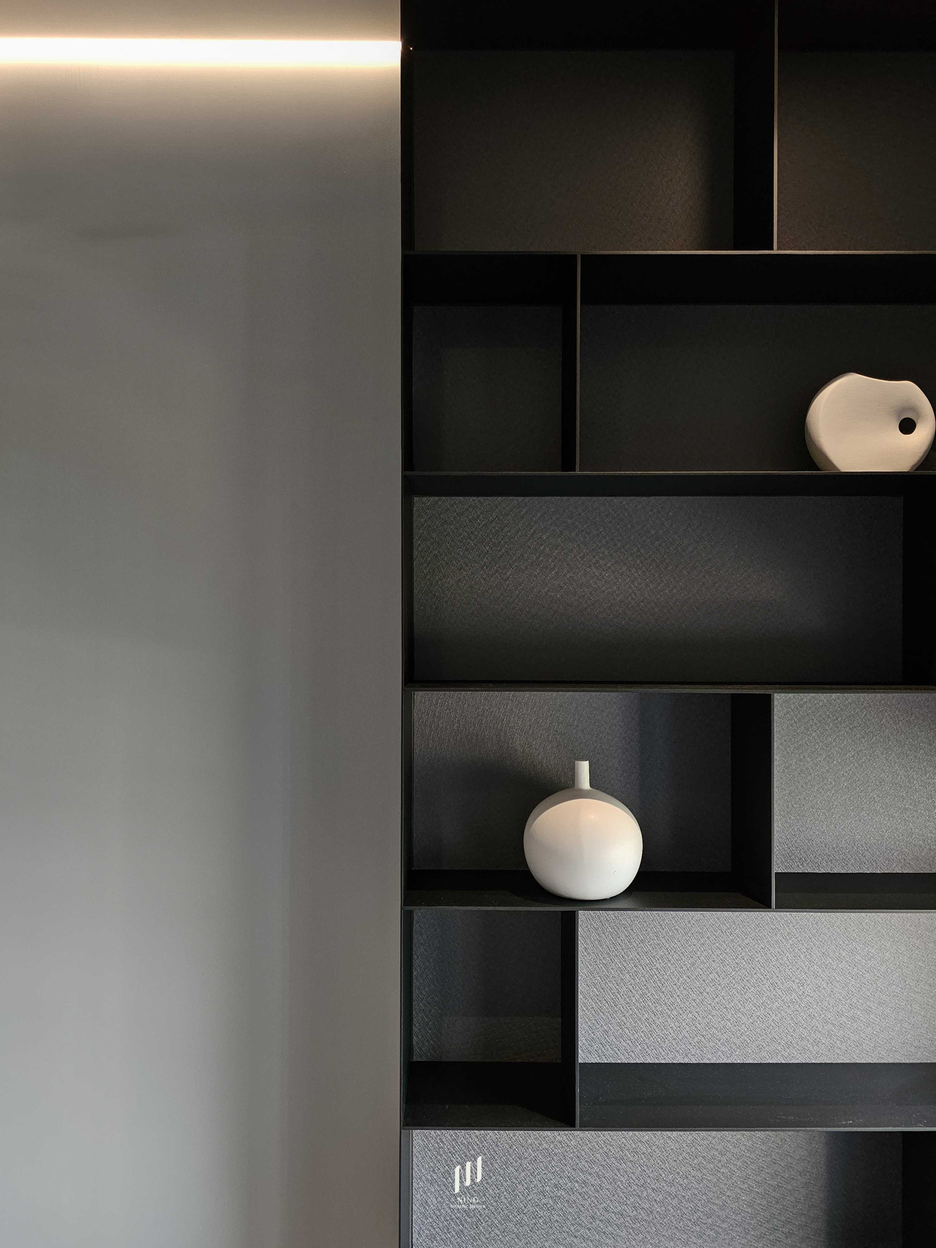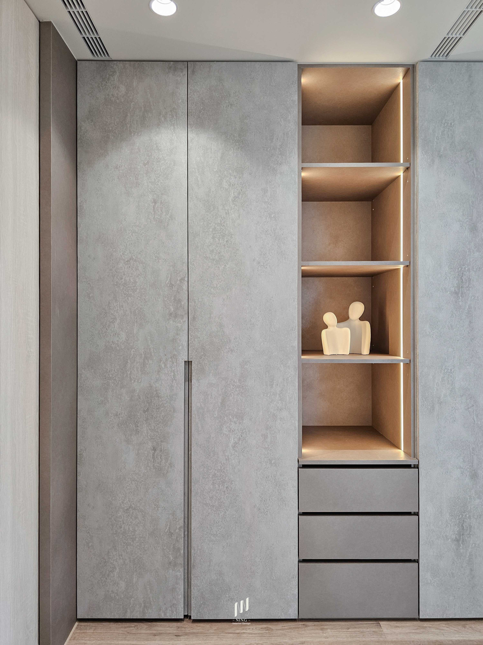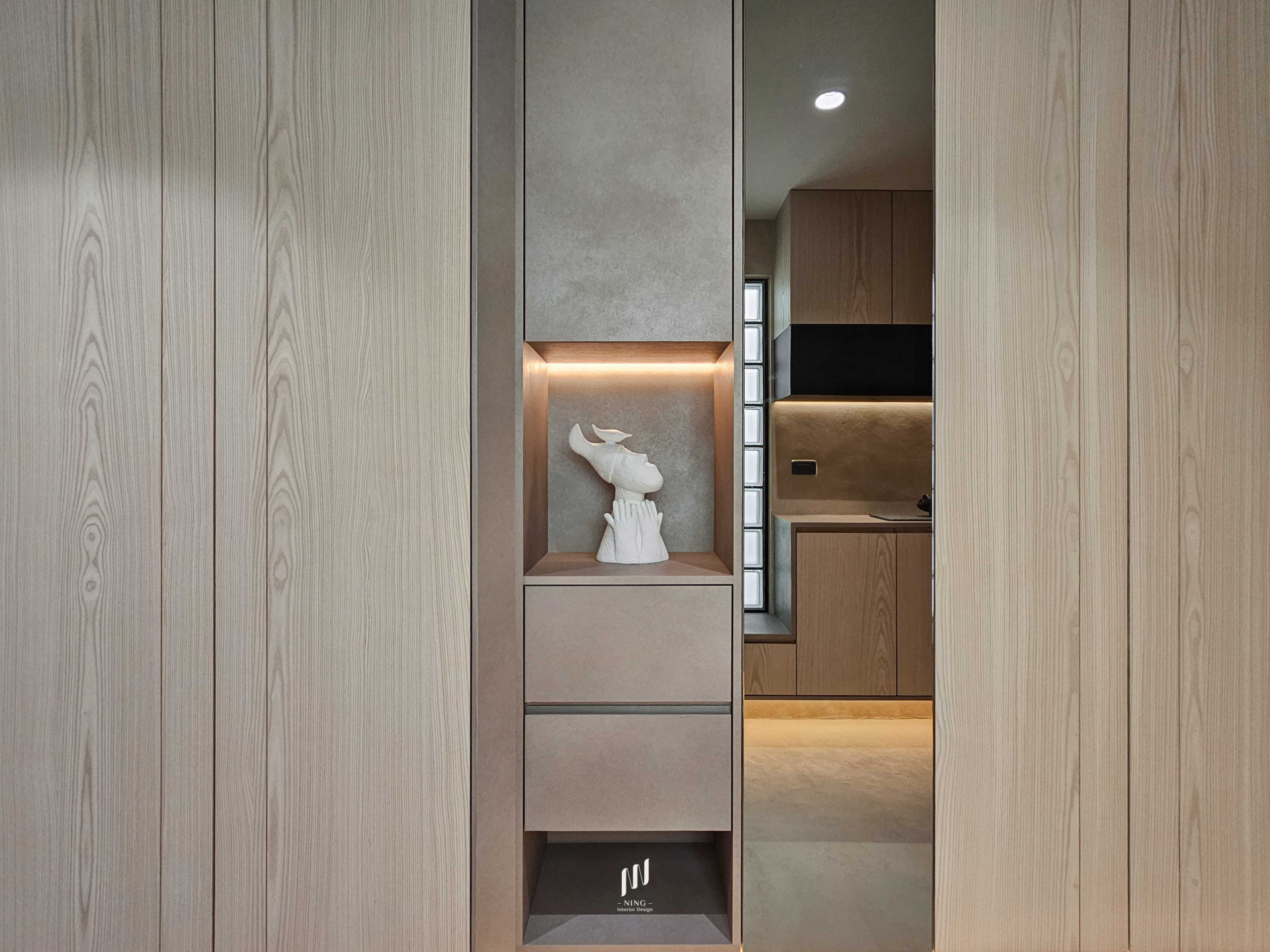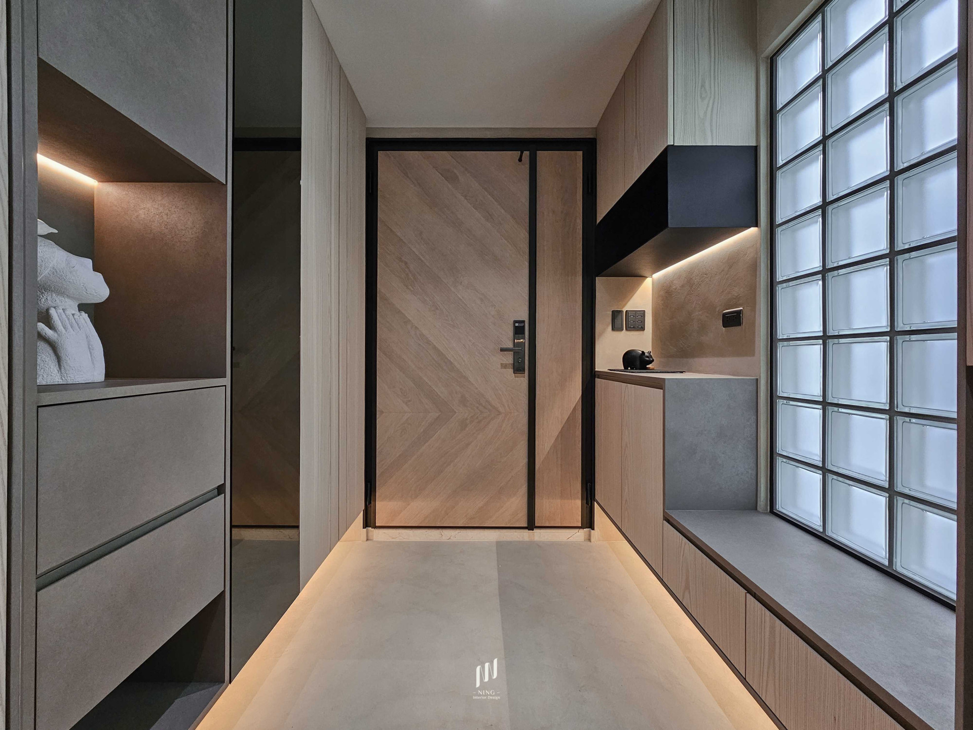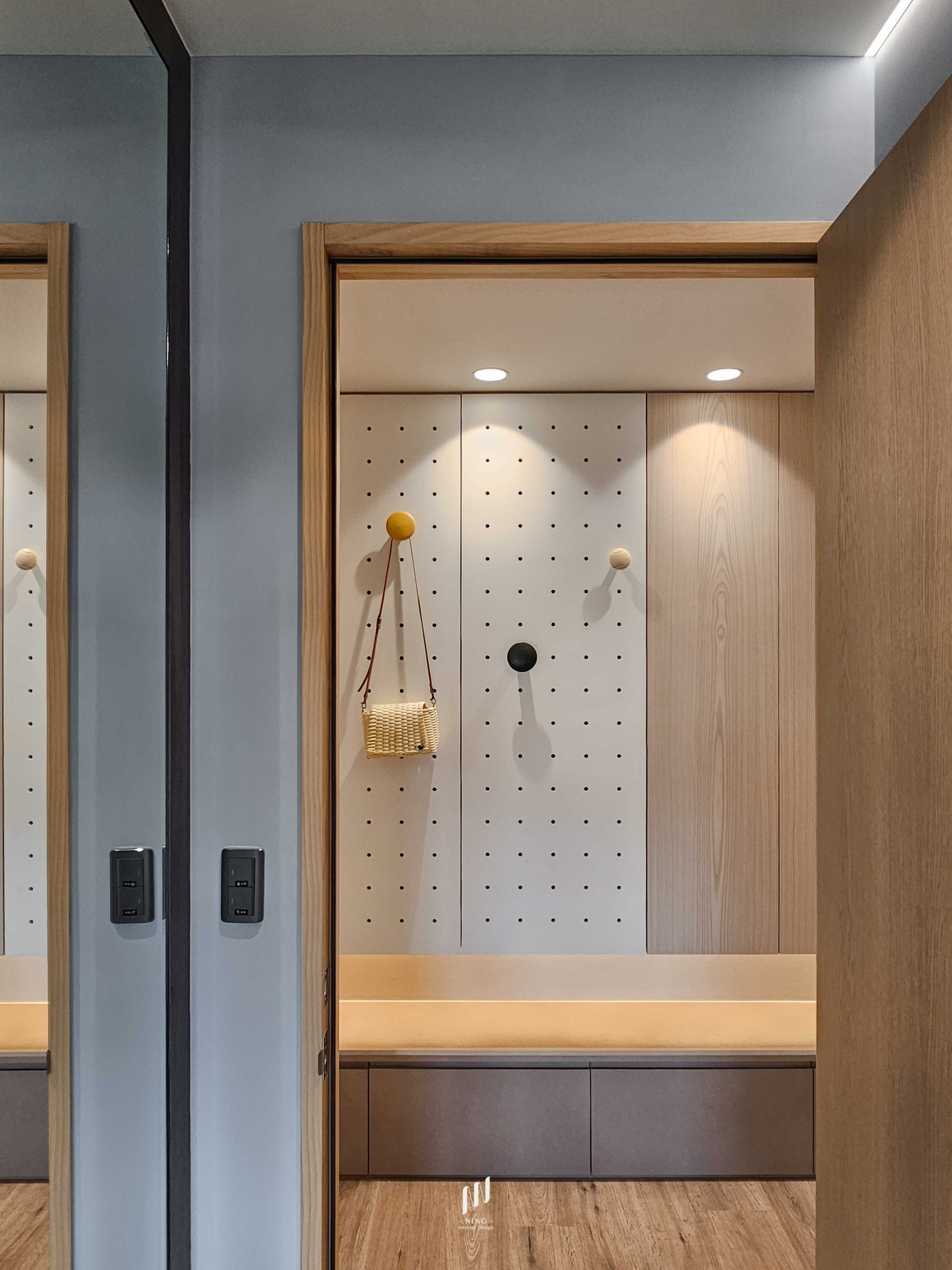 以設計留白的家居美學,詮釋了家庭與藝術的和諧共存。走進玄關,暖色系設計營造出自然而明亮的氛圍,中段的展示櫃中巧妙地收納了大量的鞋子和展示品,穿衣鏡巧妙地結合在鞋櫃中,實現多功能的使用,保有空間中的機能,收納融於無形,降低視覺干擾,只留下簡約純粹。