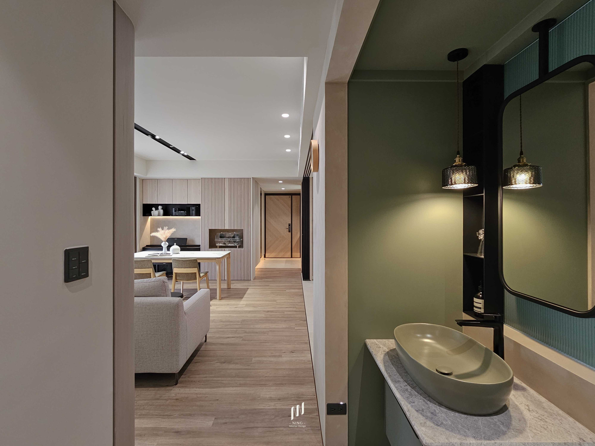 改造走道上的空間,公共洗手台以莫蘭迪綠玻璃打造,兼具採光功能,透過光影的魔法,賦予空間更多通透感,同時也擴大整體的視覺空間感。