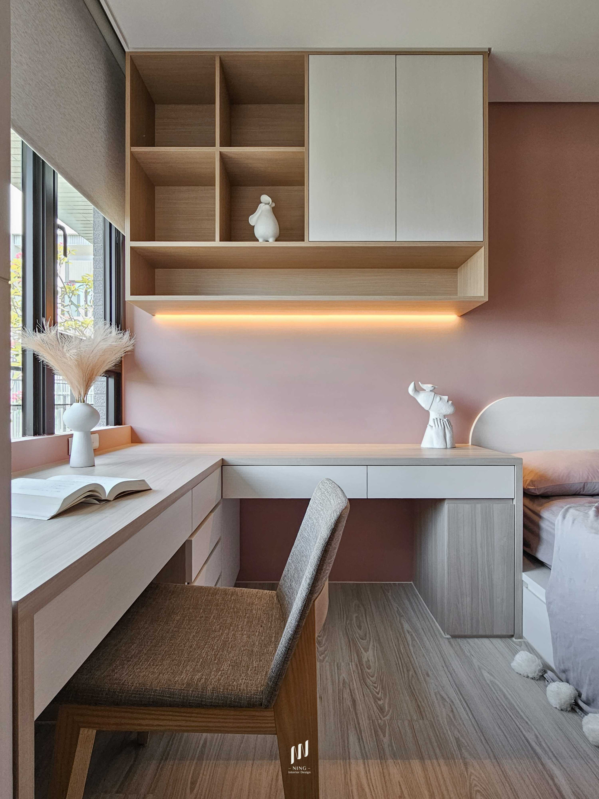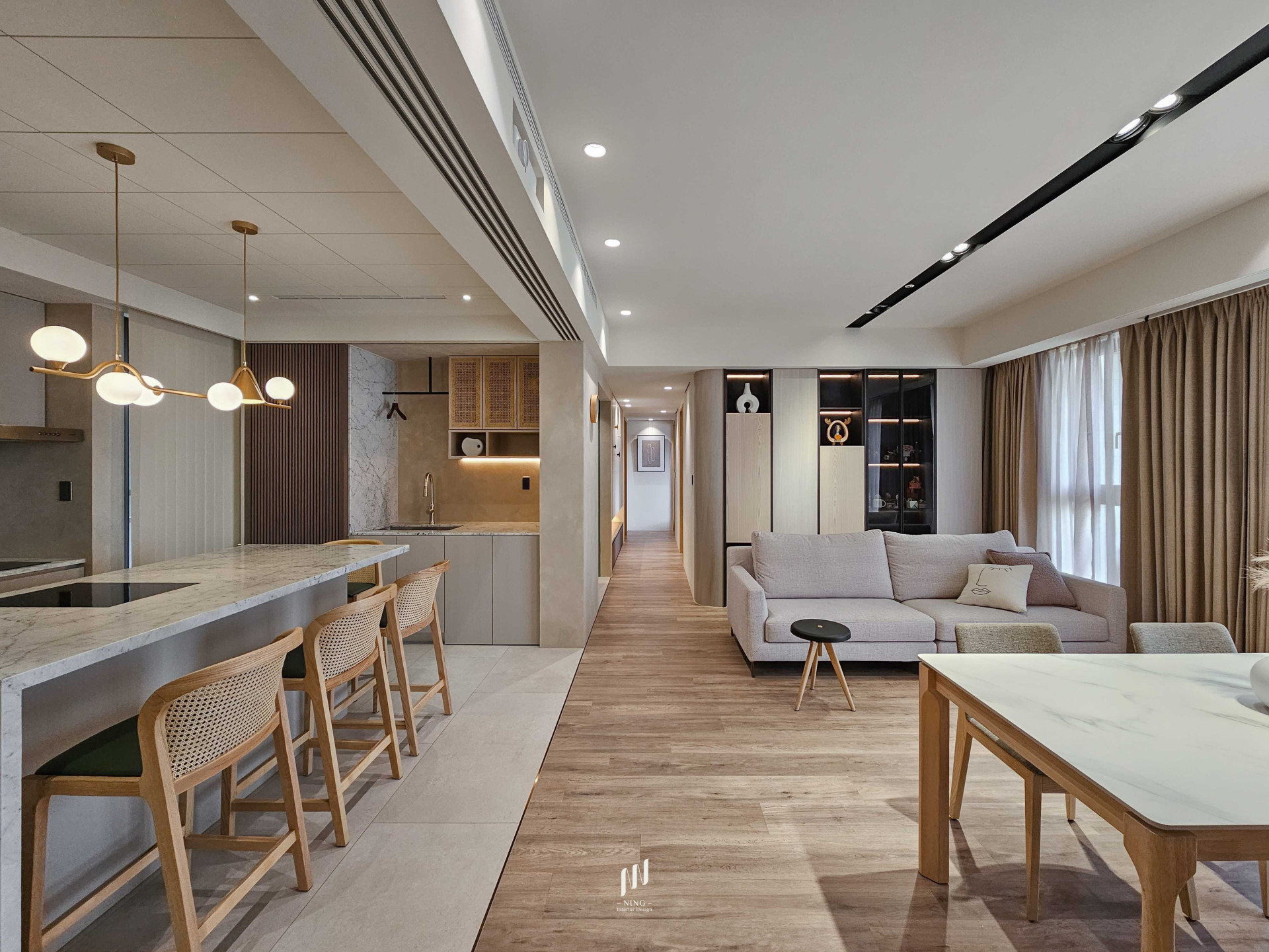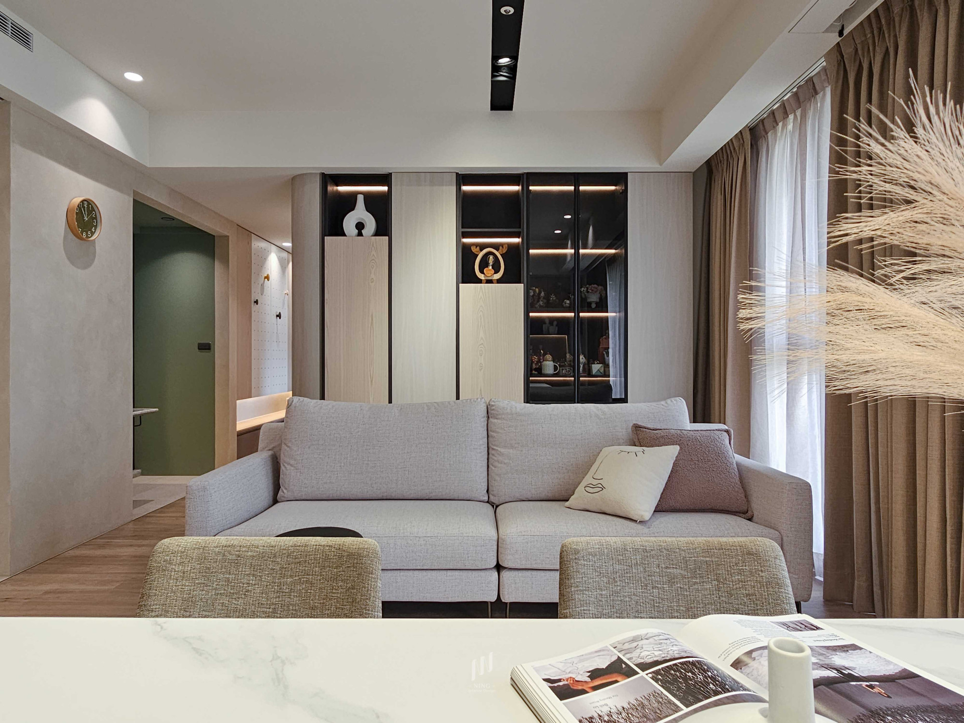 原本的四房格局被重新塑造,陽台與臥室A的融合打破了空間的界限,形成了一個通透而開放的空間。在這個空間裡沒有電視,因為小孩喜歡閱讀,家中擁有許多書櫃,沙發背後牆與走道旁的開放式書櫃洞牆成為了書籍展示及收納的理想場所,業主的編織愛好也巧妙地融入這場視覺的盛宴。