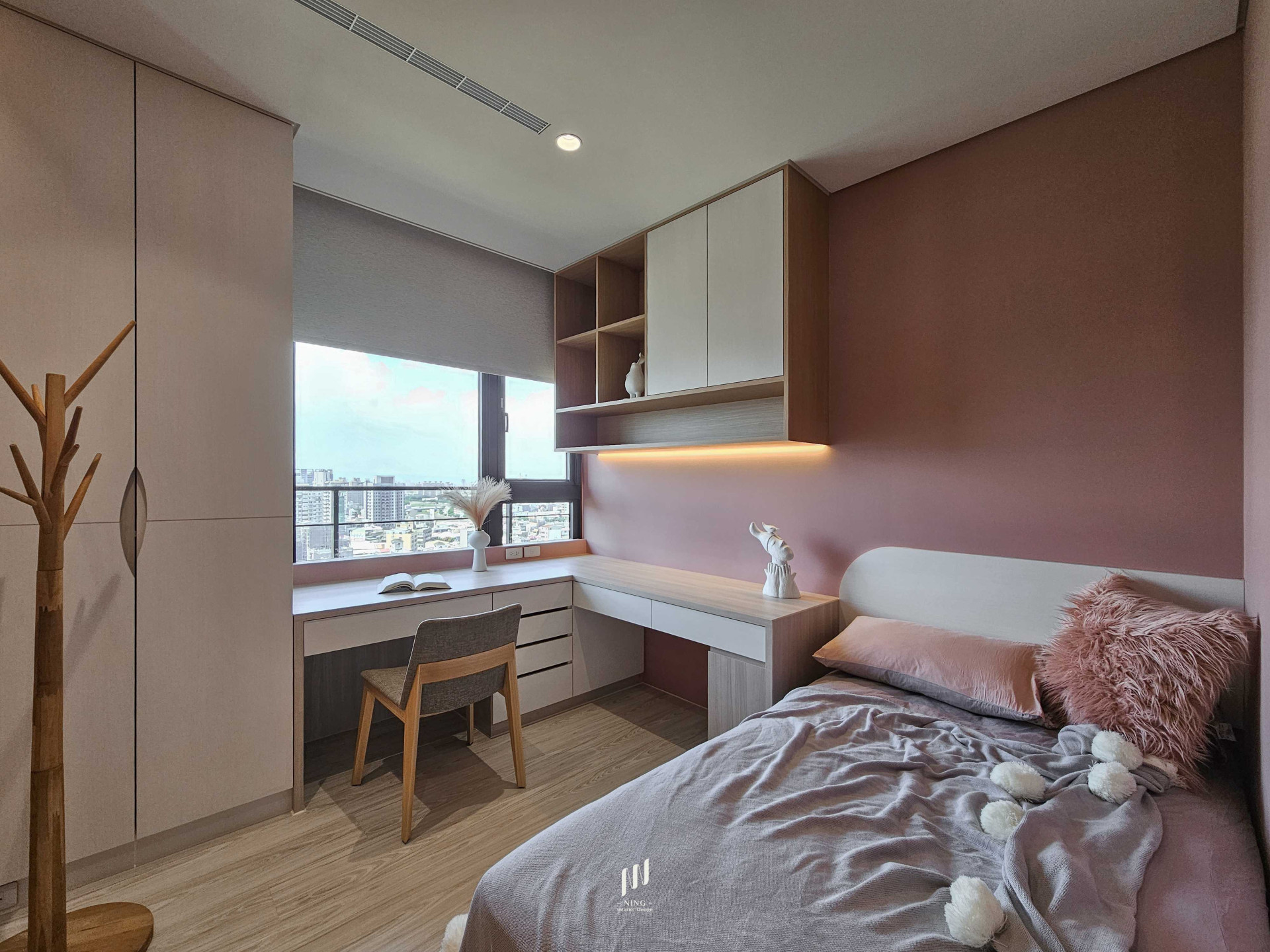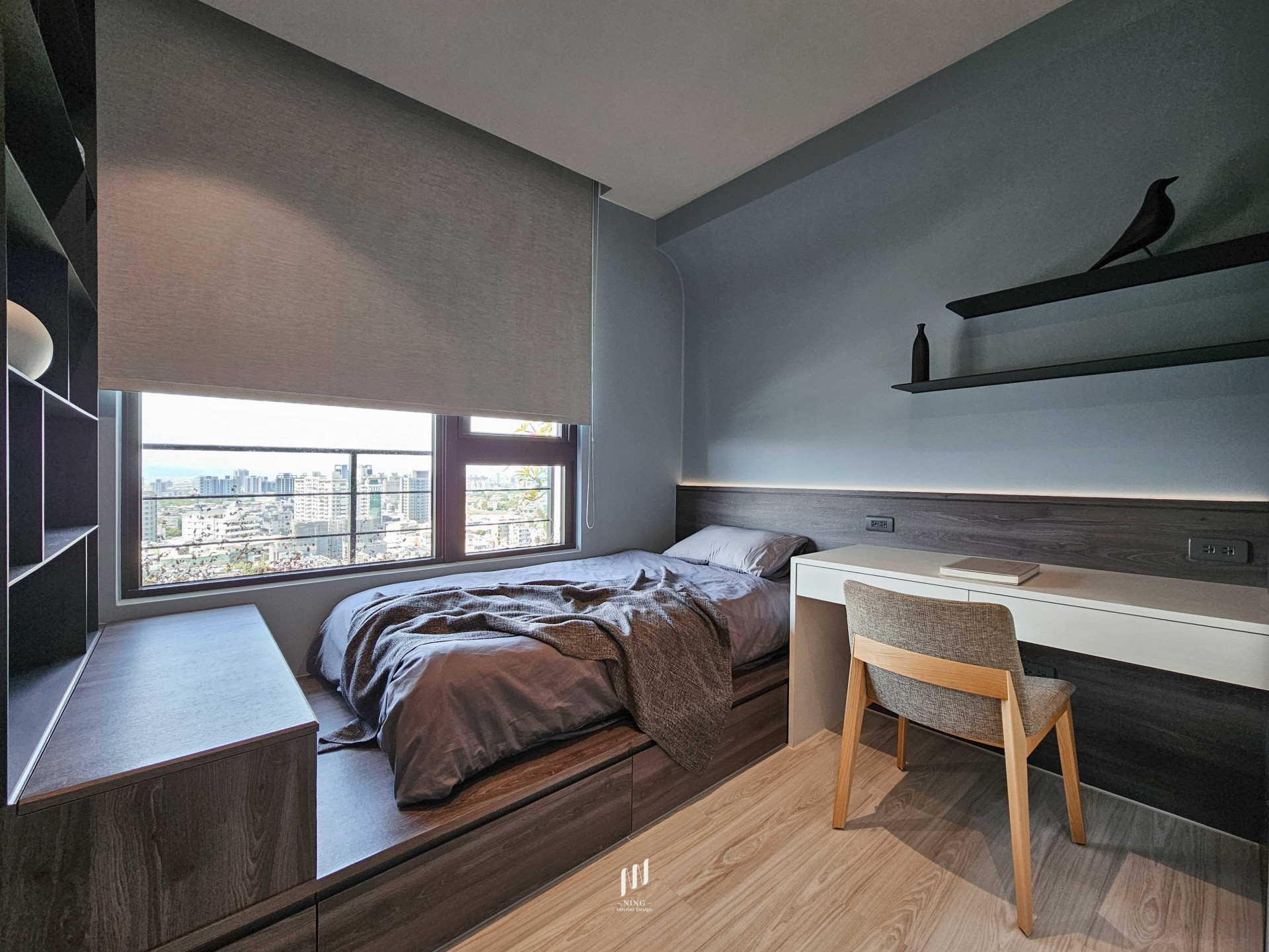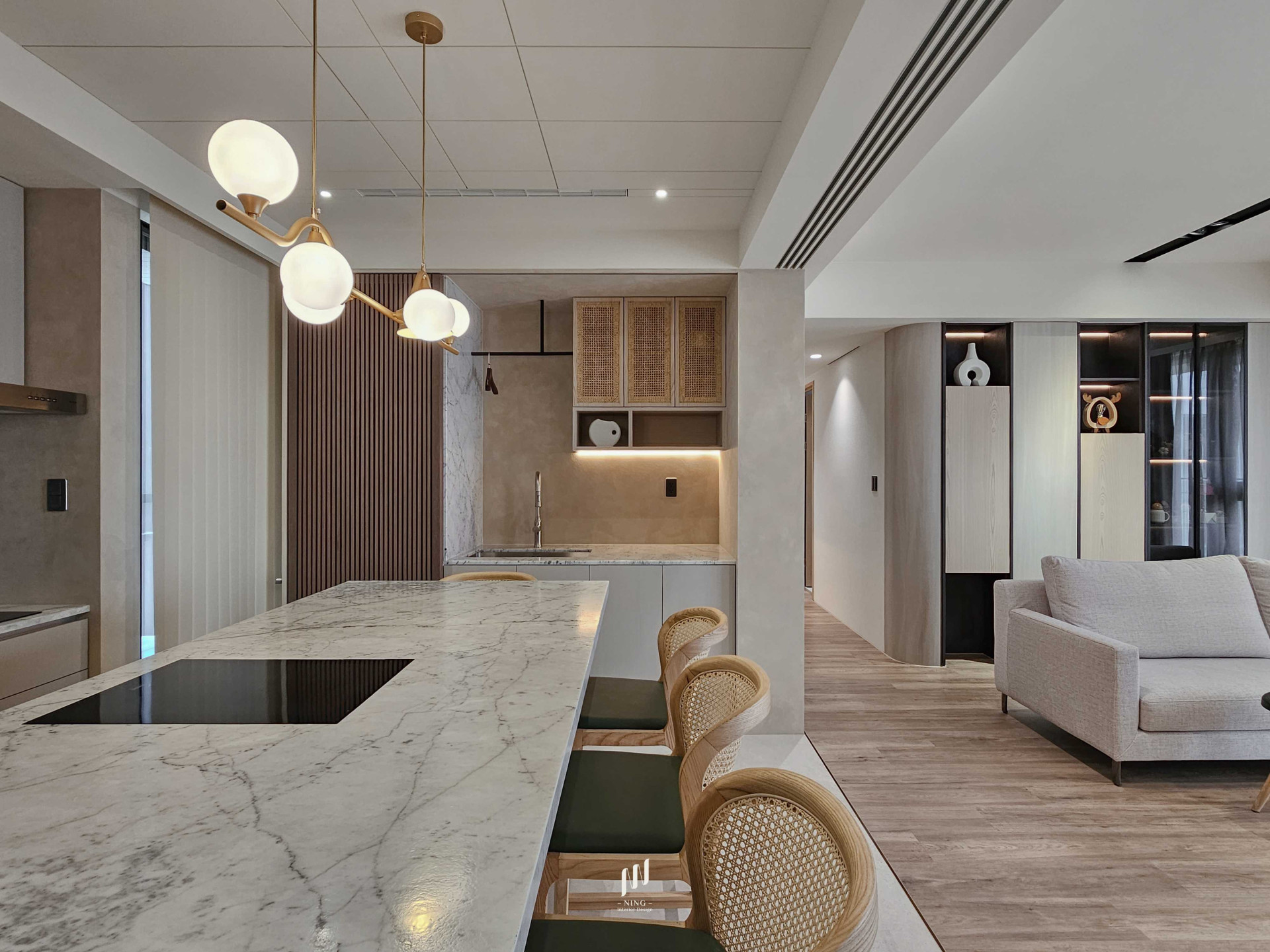 原本的四房格局被重新塑造,陽台與臥室A的融合打破了空間的界限,形成了一個通透而開放的空間。在這個空間裡沒有電視,因為小孩喜歡閱讀,家中擁有許多書櫃,沙發背後牆與走道旁的開放式書櫃洞牆成為了書籍展示及收納的理想場所,業主的編織愛好也巧妙地融入這場視覺的盛宴。